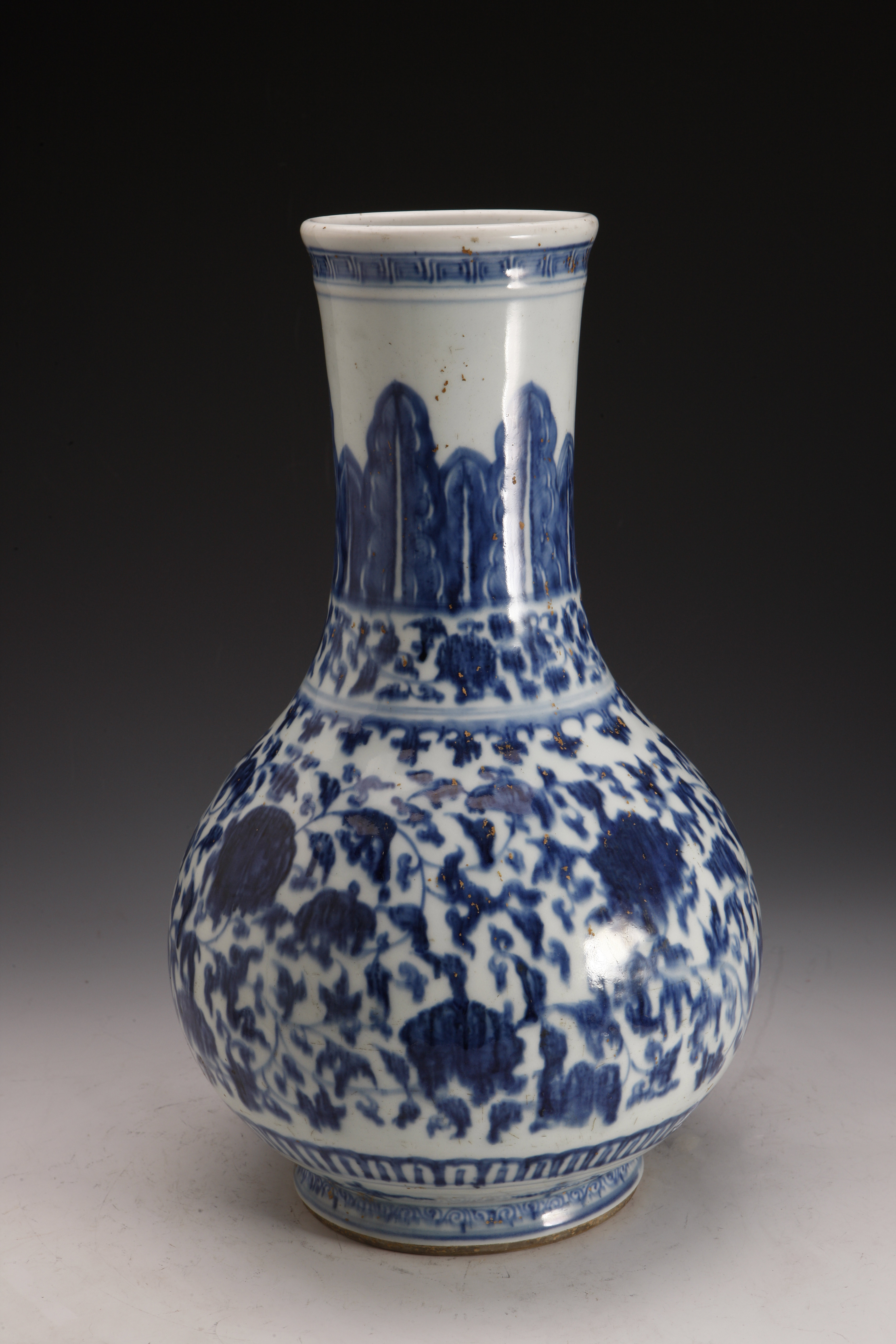 名称: 清雍正青花缠枝莲花瓶 年代: 清·雍正 类型: 质地: 尺寸: 高42厘米,口径10.5厘米,底径12.5厘米 来源: 广东省博物馆 瓶撇口,短颈,橄榄形腹,圈足。颈部绘蕉叶纹,肩部绘缠枝石榴纹带及如意头纹一周。腹部为折枝桃、石榴、牡丹花卉,胫部饰凸起并勾描青花的变形莲瓣纹。 底书双行正楷“大清雍正年制”款。此瓶造型别致秀美,胎质细腻洁白,釉色莹润透亮,青花色调浓艳深沉,为雍正青花官窑器的佳品。