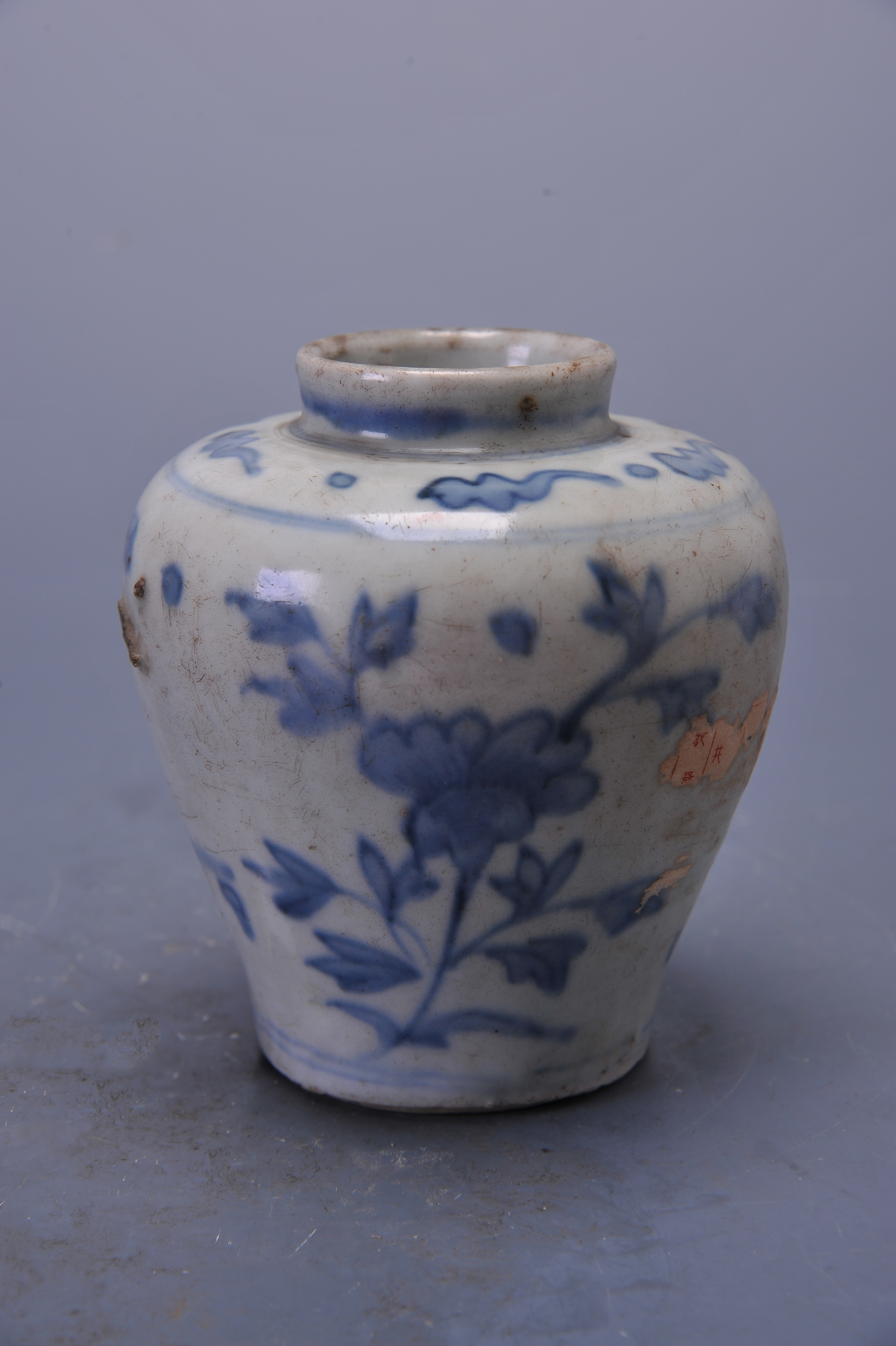 名称: 明青花花卉罐 年代: 明·成化 类型: 质地: 尺寸: 高12厘米,口径5.7厘米,底径8.6厘米 来源: 广东省博物馆 罐圆口,短直颈,丰肩,圆弧形腹,平底浅挖足。口沿绘弦纹一周,肩部和近圈足处绘海水波浪纹,腹部绘莲叶、莲蓬、花卉等纹样。底部以青花书“大明成化年制”双圈楷书款。该器造型隽秀端庄,胎质细腻洁白,青花发色淡雅柔和。
