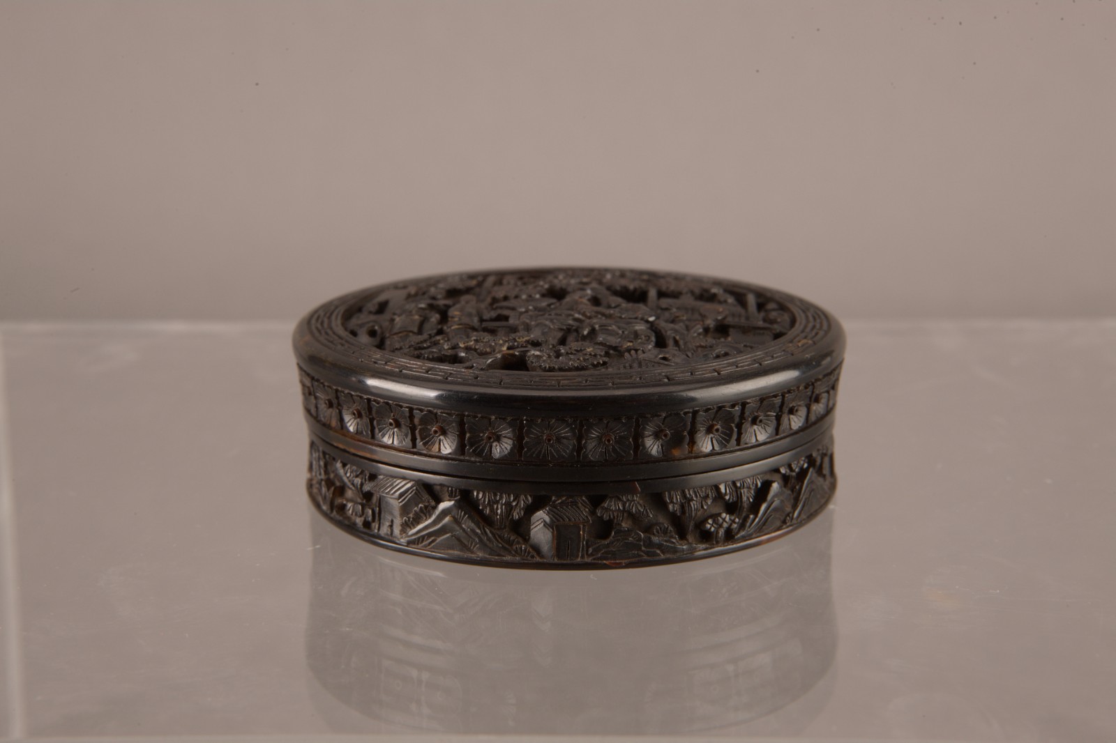 十九世纪玳瑁浮通雕人物图圆盖盒