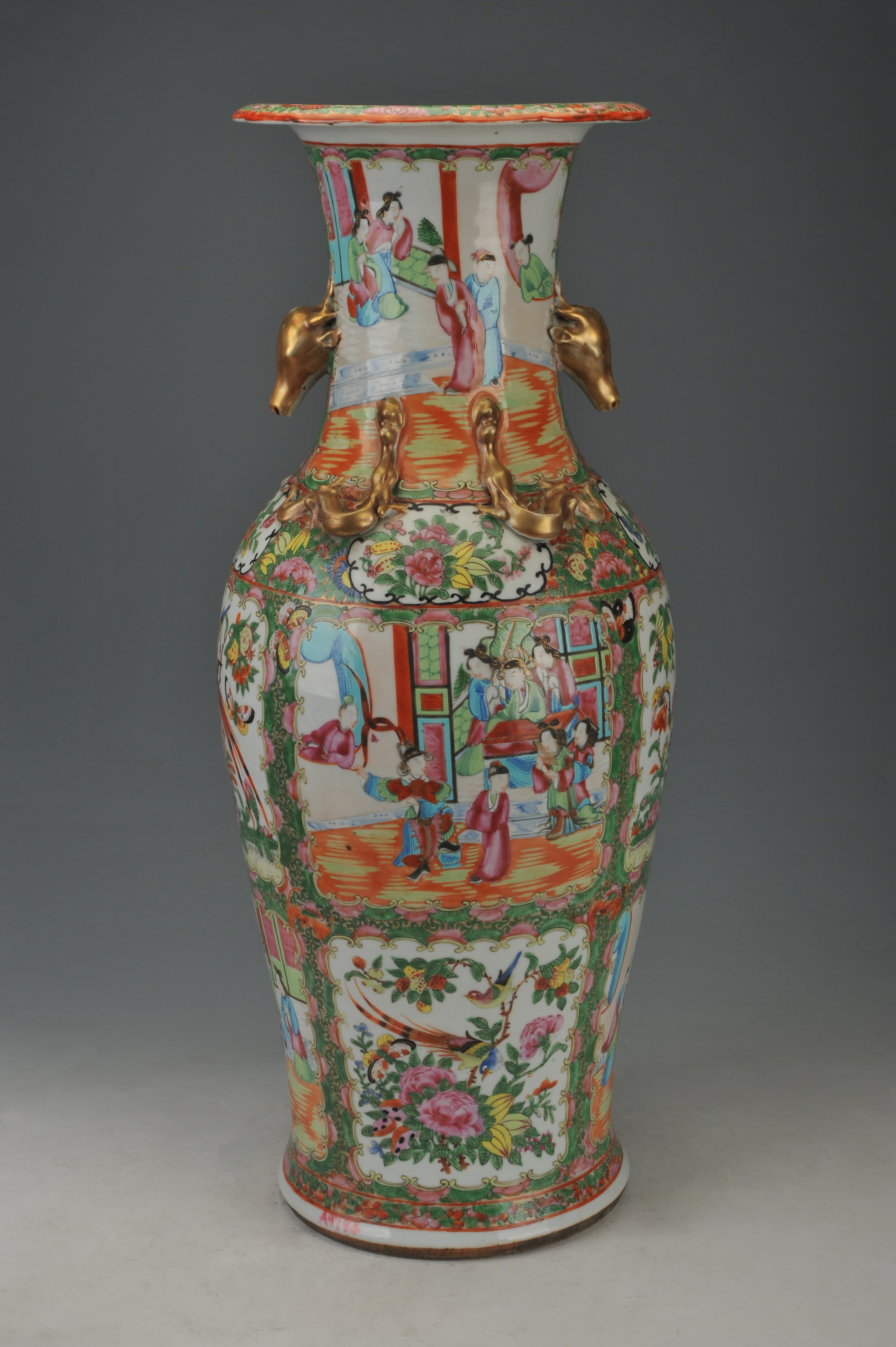 名称: 清同治广彩开光人物图双兽耳瓣口大瓶 年代: 清同治 类型: 瓷器 质地: 瓷 尺寸: 高60厘米,口径22厘米,底径17厘米 来源: 广东省博物馆 花口外卷,胆式腹,圈足。口沿绘锦地开光一周,内绘折枝花卉,颈部以凸蟠螭缠绕,满身锦地开光,开光内绘人物故事与花鸟纹相间,构图繁而有序,画工精致。
