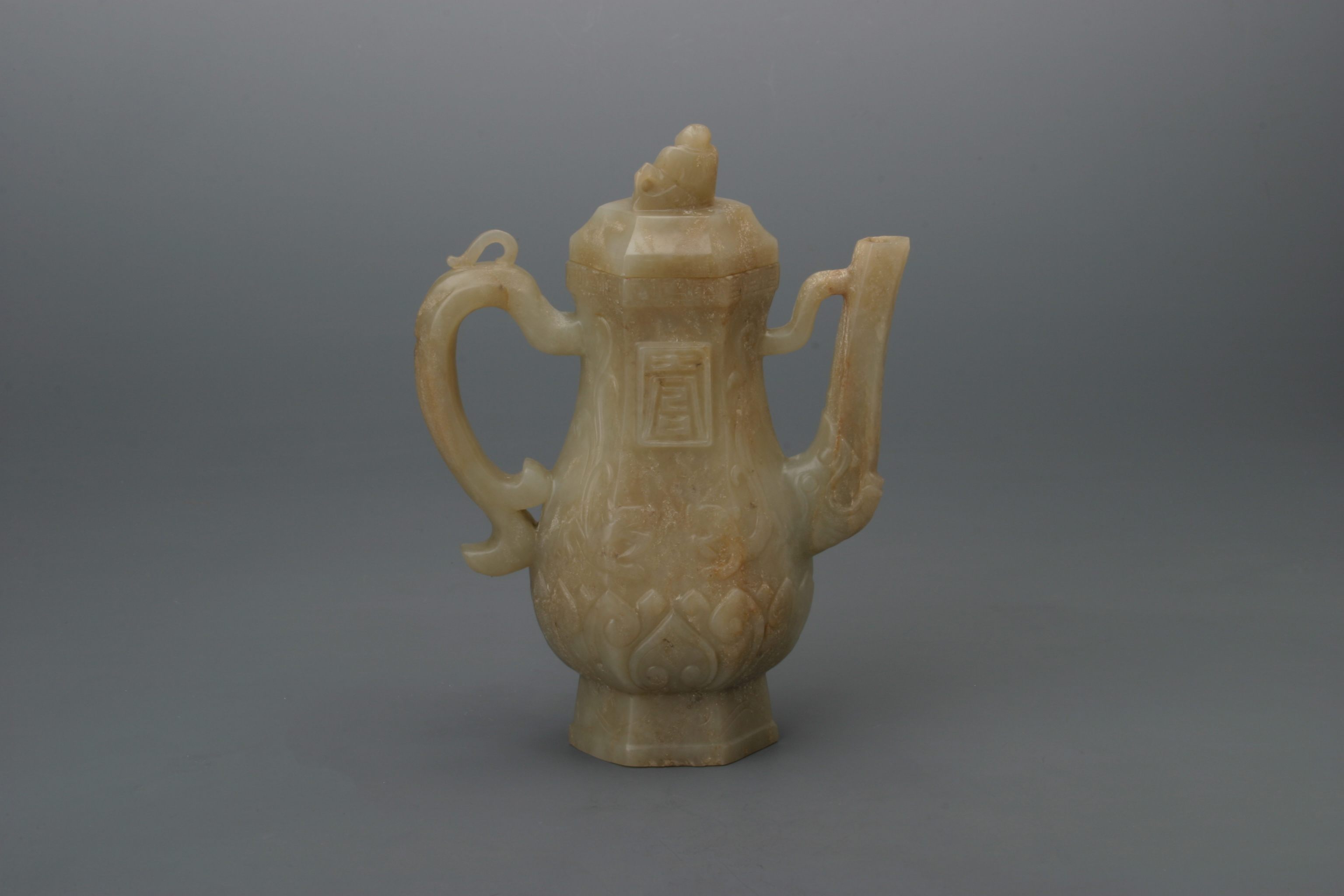 明白玉寿字带盖把壶