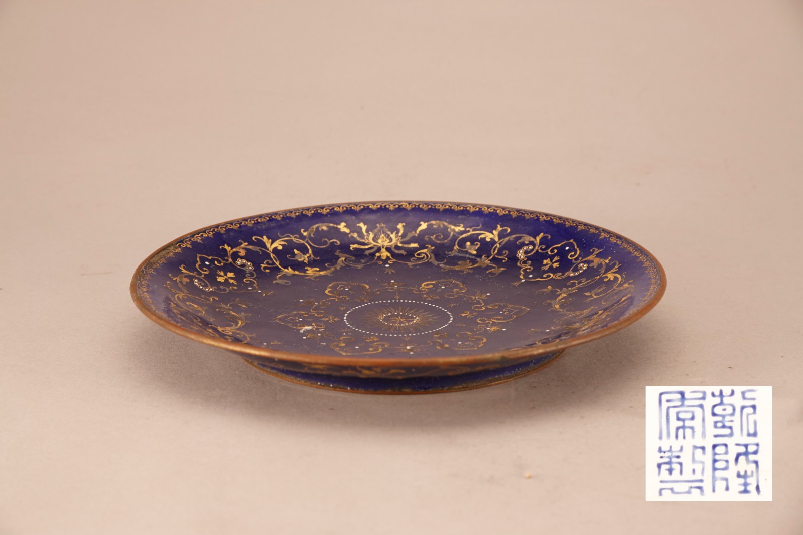 清乾隆款铜胎画珐琅蓝地描金花卉碟