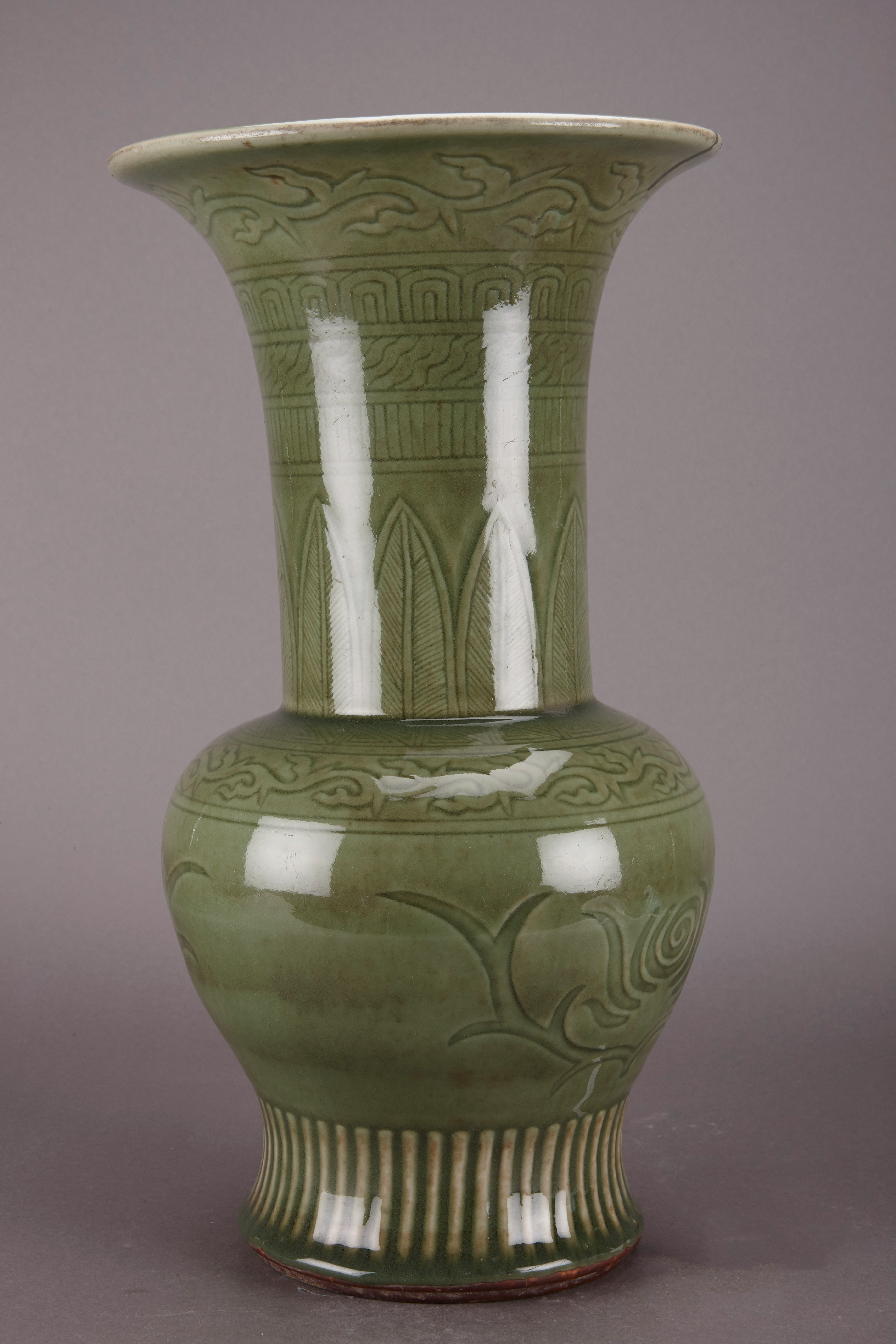清乾隆豆青釉开窗青花釉里红夔凤耳洗口瓶