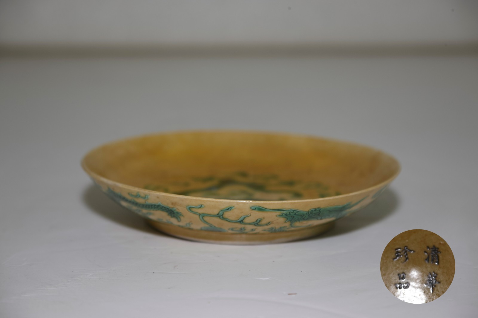 清清华珍品款黄釉绿龙盘