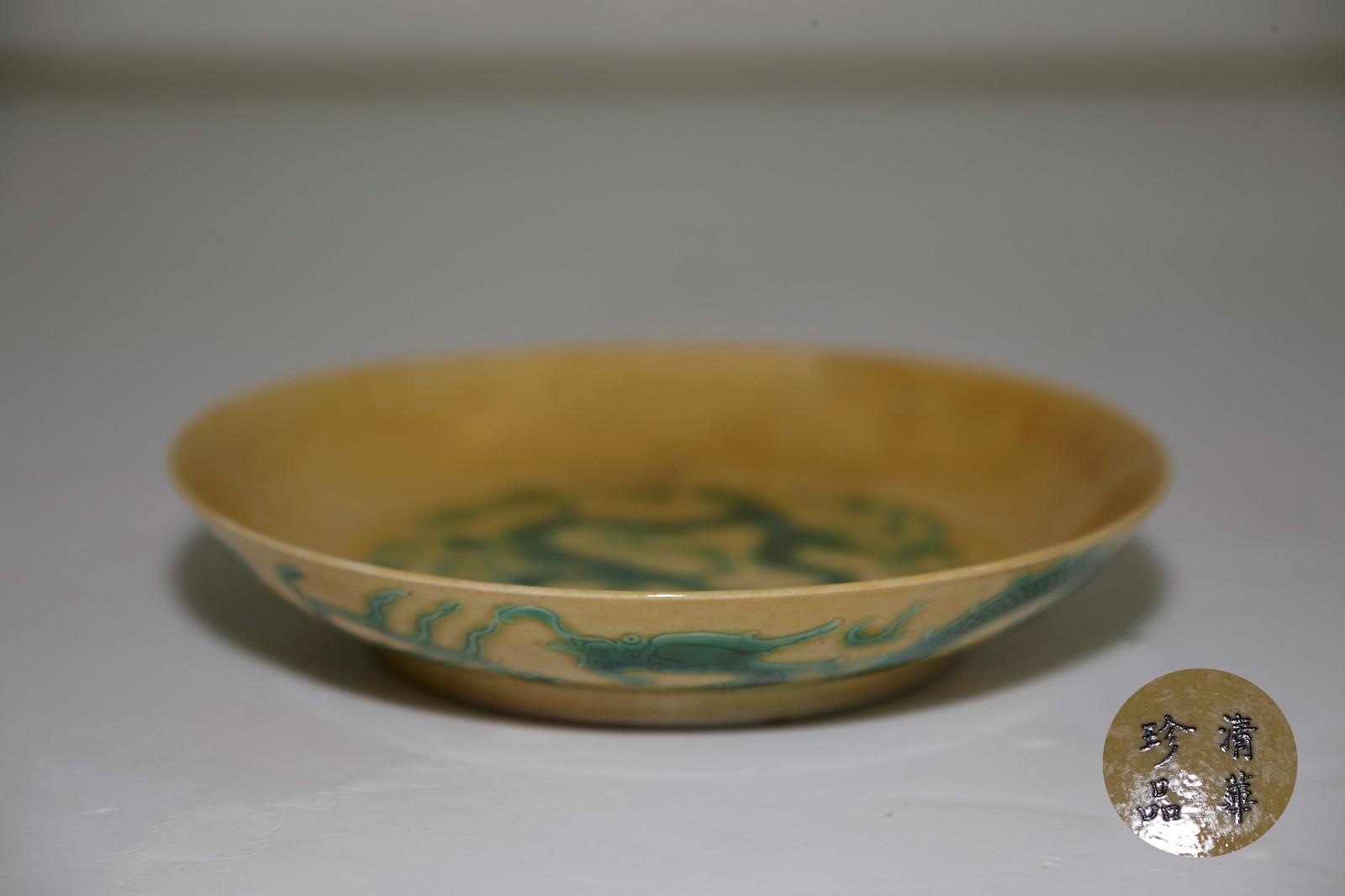 清清华珍品款黄釉绿龙盘