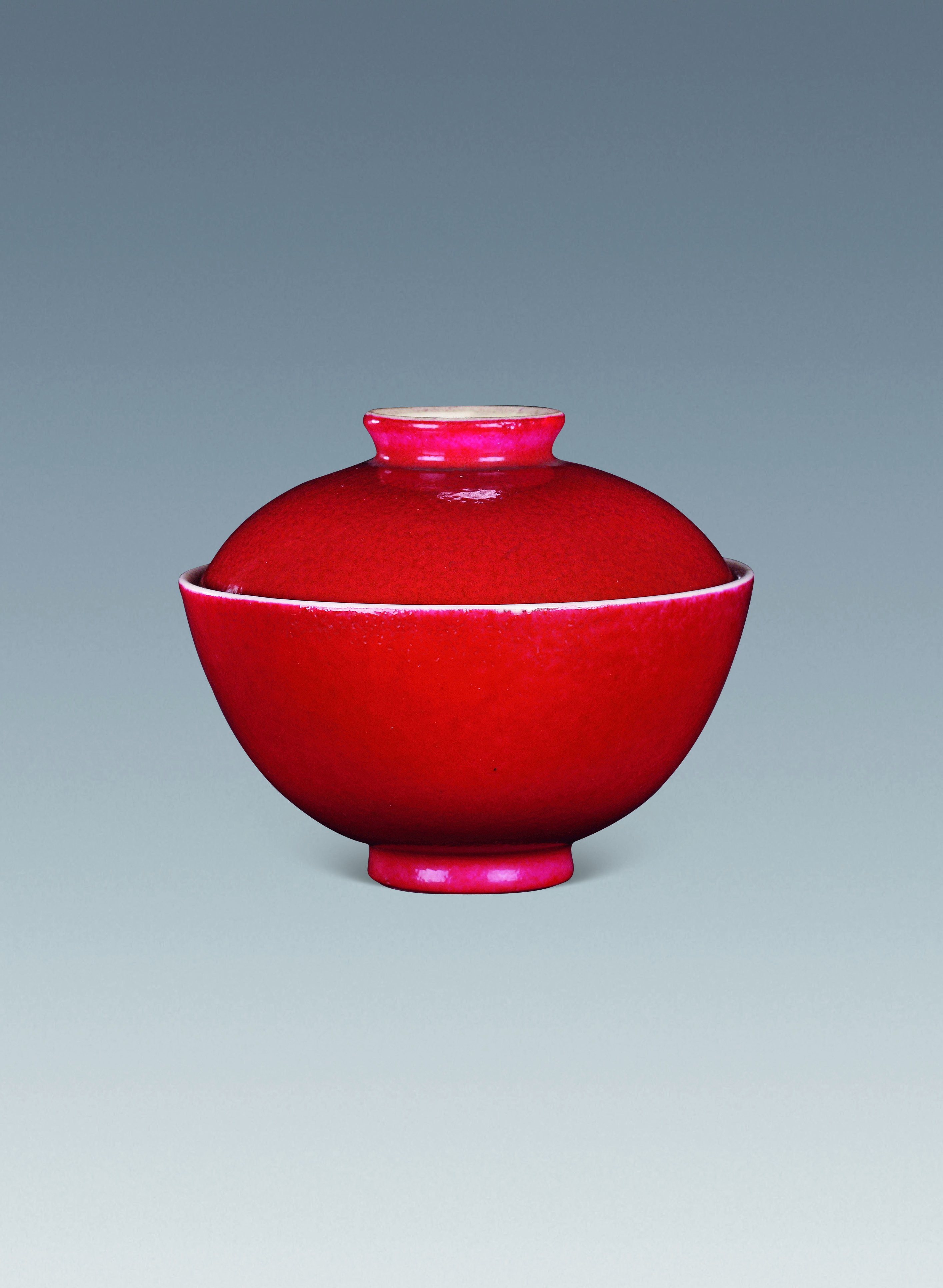 名称: 清乾隆款芸豆红瓷盖碗 年代: 清 类型: 瓷器 质地: 瓷 尺寸: 高8.3 厘米,口径9 厘米,底径3.3 厘米 来源: 广东省博物馆 敞口,深弧腹,圈足,拱形盖,抓手钮,扣合于碗口内。底书青花“乾隆年制”篆书款。盖及碗内壁施白釉,外壁施罩胭脂红釉,碗口露白边,白釉洁白细腻,红釉呈色浓艳,微泛紫色调。造型端庄典雅,胎骨轻薄,娇媚醉人,为清代官窑的精品之作。