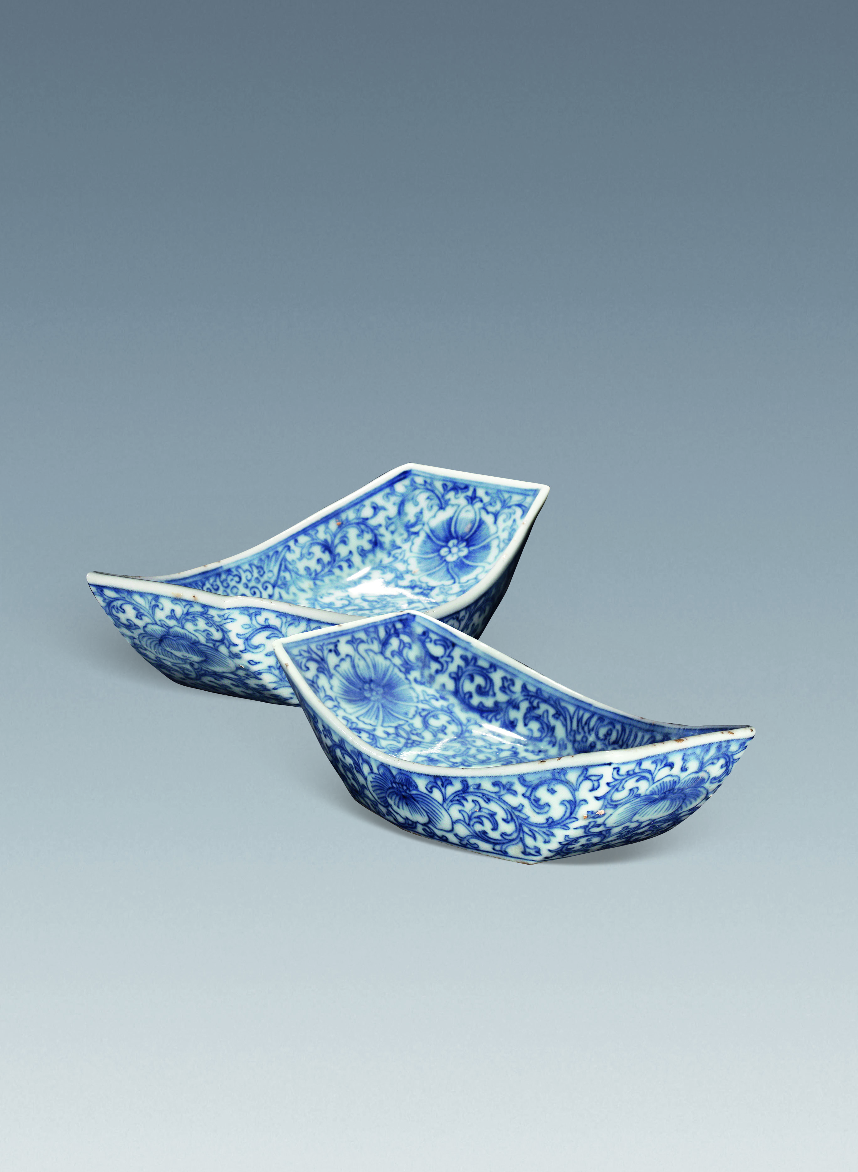 名称: 清乾隆款青花船形碟 年代: 清 类型: 瓷器 质地: 瓷 尺寸: 高3.8 厘米, 口径14.2~14.9 厘米,底径6~8 厘米 来源: 广东省博物馆 舟形。足底施白釉,内署青花“乾隆年制”四字篆书款。内外通体绘青花缠枝纹和团花纹,内腹留圆形开光,内绘青花篆体“寿”字纹,釉面洁白,青花发色淡雅,造型别致。茶船又称为茶托、茶拓子,最早出现于南朝时期,主要是防烫手以承茶杯之用,到清代,茶托形状各异,因其形似舟,故称之为茶船。