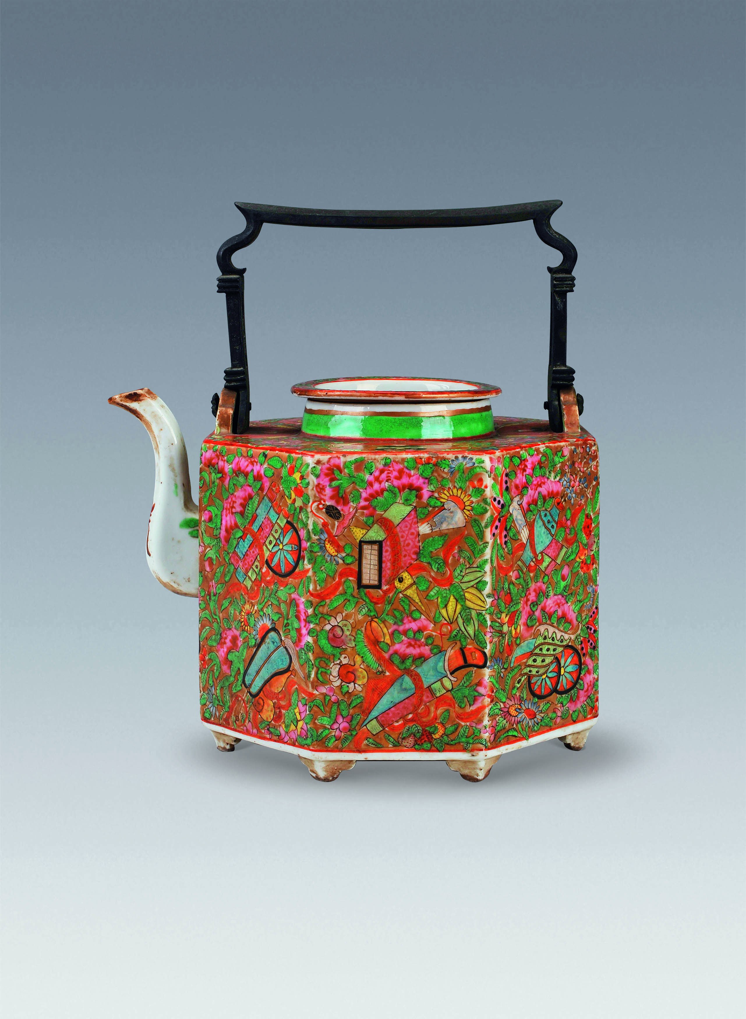 名称: 清光绪广彩铜提梁有盖八角瓷茶壶 年代: 清 类型: 瓷器 质地: 瓷 尺寸: 腹围17.3 厘米,口径7.9 厘米 来源: 广东省博物馆 青玉,色泽温润,折枝花形杯,六瓣花形杯身,撇口、深腹,杯身内底刻涡状风车形圆花心,粗大的枝杆由口沿向下弯曲沿腰伸展至杯的底部,以浮雕、镂通雕的形式巧作成花形杯的把柄和底足,此花杯以饱满的花朵作器型,粗枝大叶,含苞待放的花蕾相衬托,造型别致、雕刻生动写实。