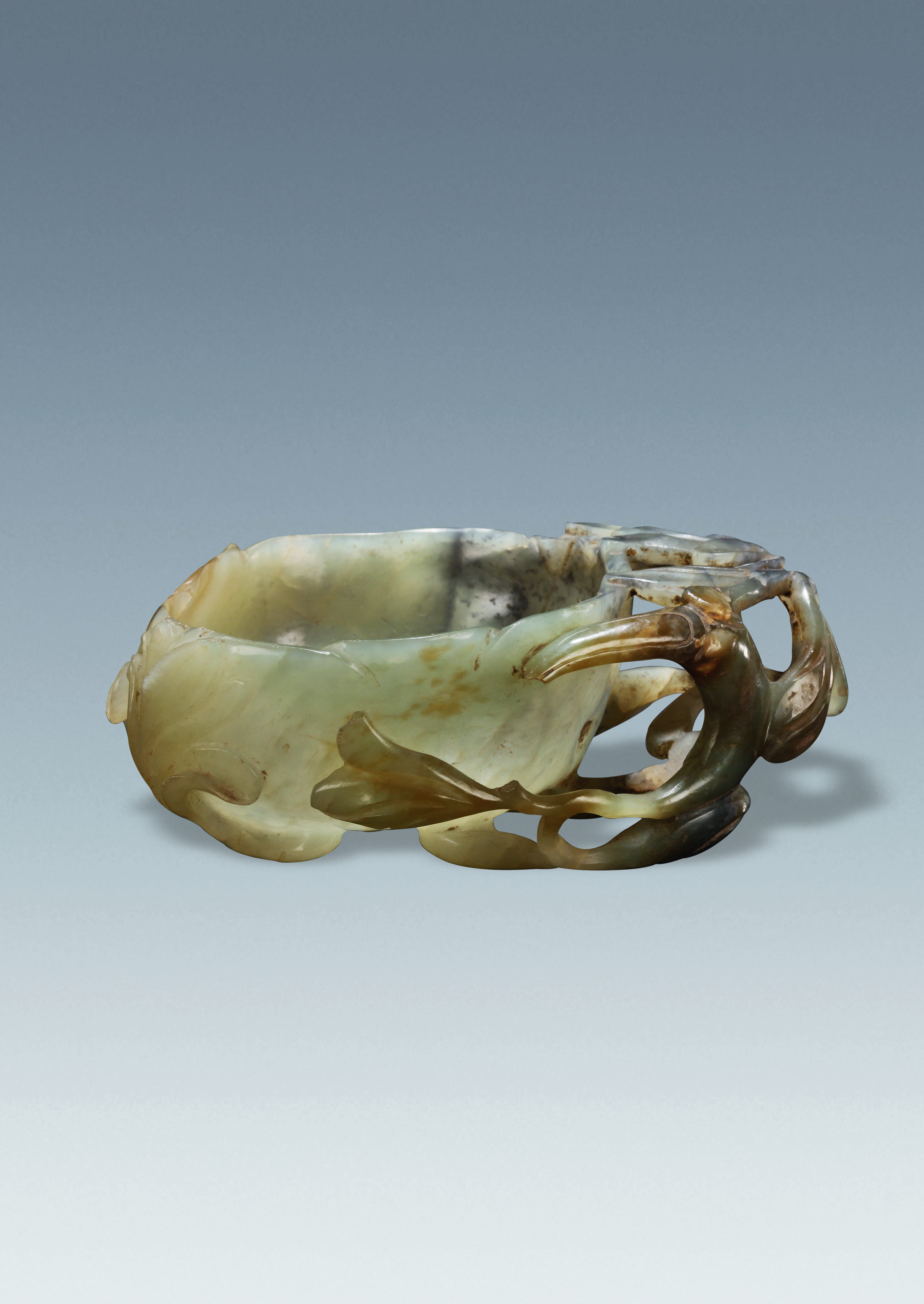 名称: 明早期墨玉白兰耳杯 年代: 明 类型: 玉石器、宝石 质地: 宝玉石 尺寸: 高4.8 厘米,口径9.2 厘米 来源: 广东省博物馆 白色玉质有大面积的墨色杂质。杯为一朵盛开的玉兰花,花瓣形口,杯心凸雕一圆形花芯,玉兰花枝镂空弯曲作杯柄,并延伸至底作杯足,杯心与底浅刻花瓣及花蒂。