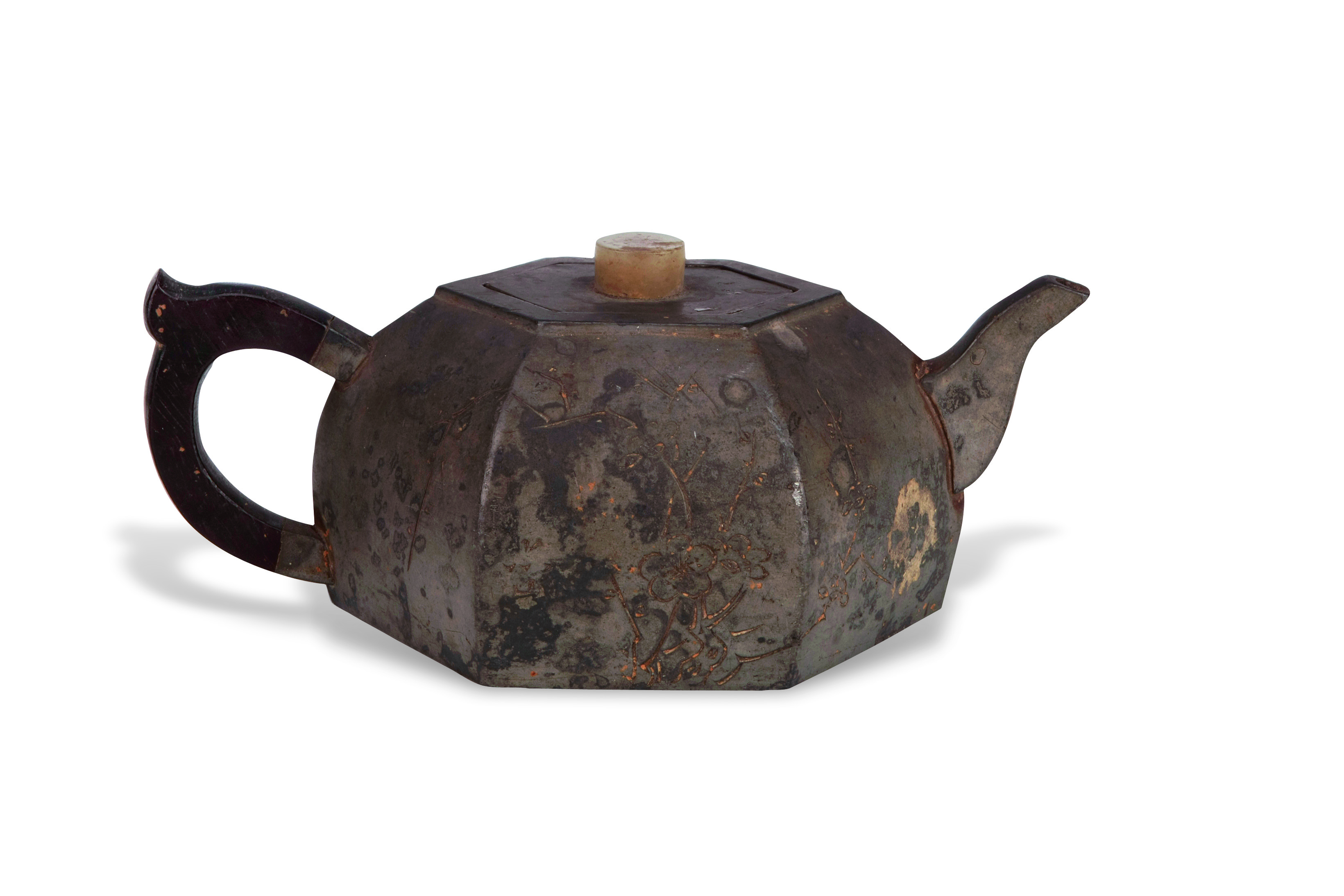 名称: 清黄洽款六角梅花纹锡壶 年代: 清 类型: 铁器、其他金属器 质地: 其他金属 尺寸: 高7 厘米,口径5.7 厘米,底径11.3 厘米 来源: 广东省博物馆 锡质。壶身横截面与盖均为六角形,柱形玉盖钮,子母口,腹起棱,红木耳,平底。腹部刻梅花图案及“汉鼎商彝清囗光风云齐日。王洽”铭文。