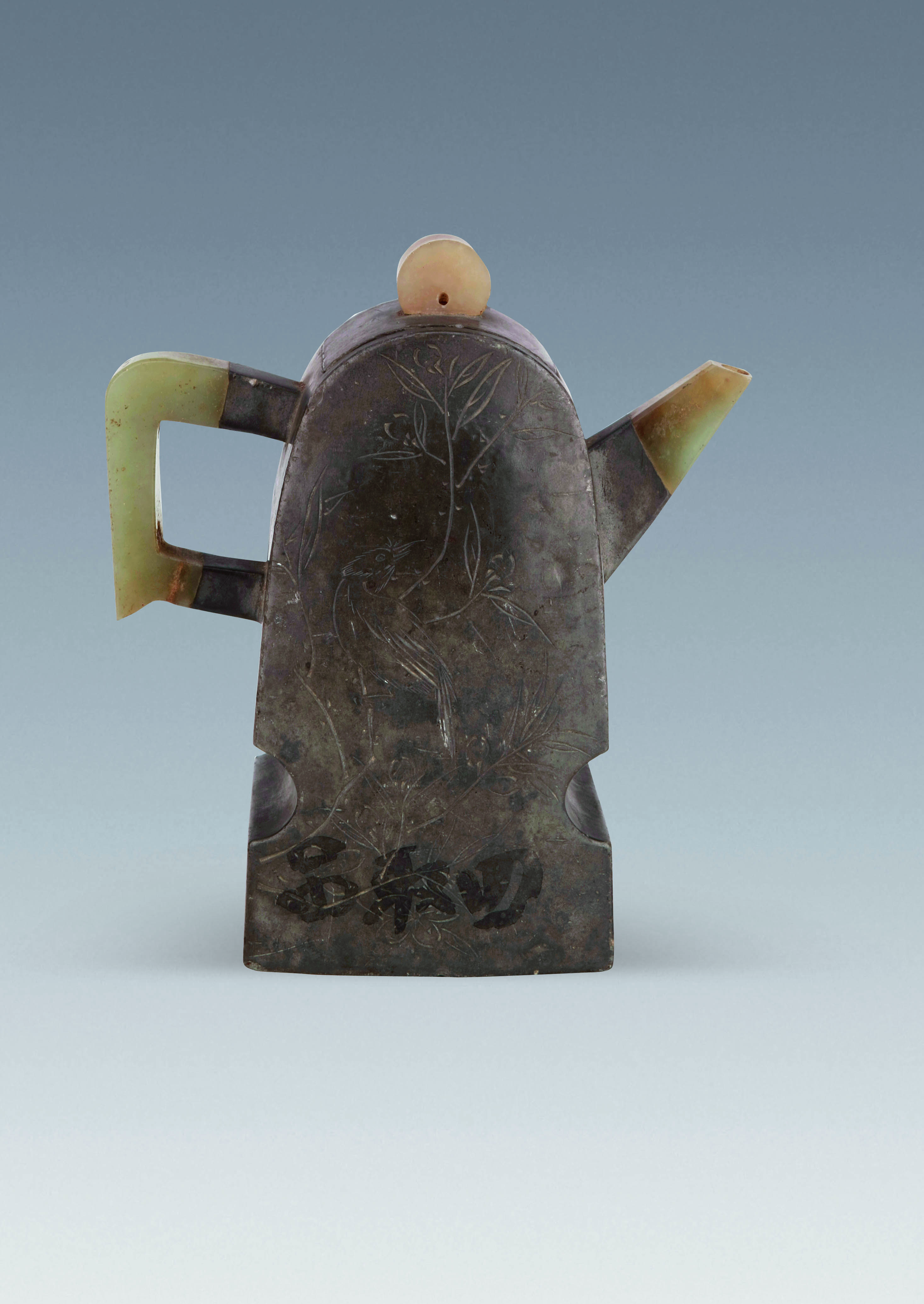 名称: 清镶玉锡茶壶 年代: 清 类型: 铁器、其他金属器 质地: 其他金属 尺寸: 高14 厘米,底宽7.2 厘米 来源: 广东省博物馆 锡质。壶身为四棱钟形,壶身下部有两条内凹弧形棱,平底。盖为方形,弧面。方形耳,直流。盖钮,耳,流分别镶玉。壶身正面刻花鸟纹饰,背面刻:“一榻茶烟结翠,半窗云雨凝香。竹庵”铭文。