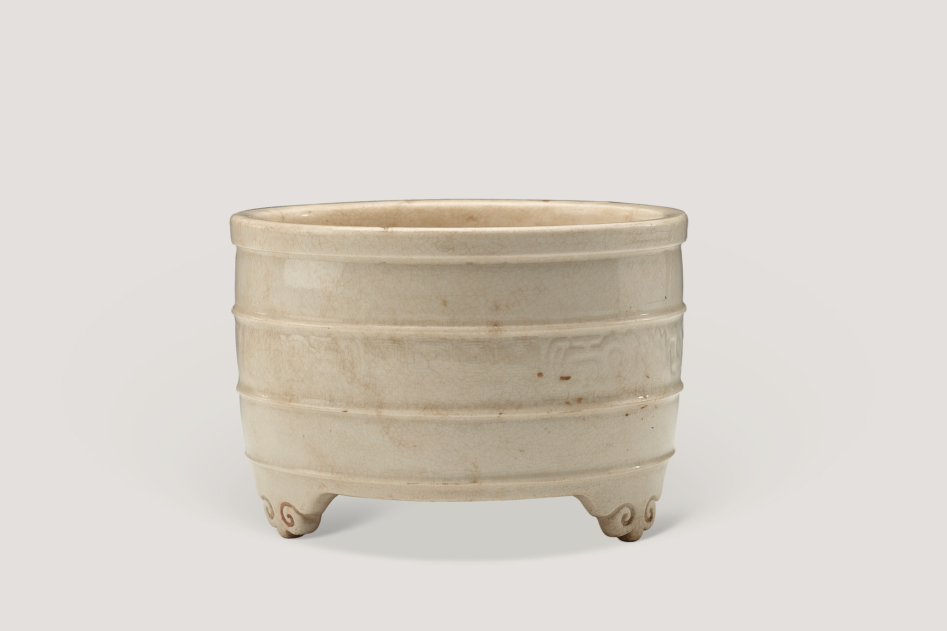 名称: 明潮州窑白釉炉 年代: 明代 类型: 瓷器 质地: 瓷 尺寸: 高8.9cm、口径13cm、底径11.5cm 来源: 广东省博物馆 唇口、筒形炉,平底、三如意足。通体施白釉,腹间刻弦纹间隔,底有釉。