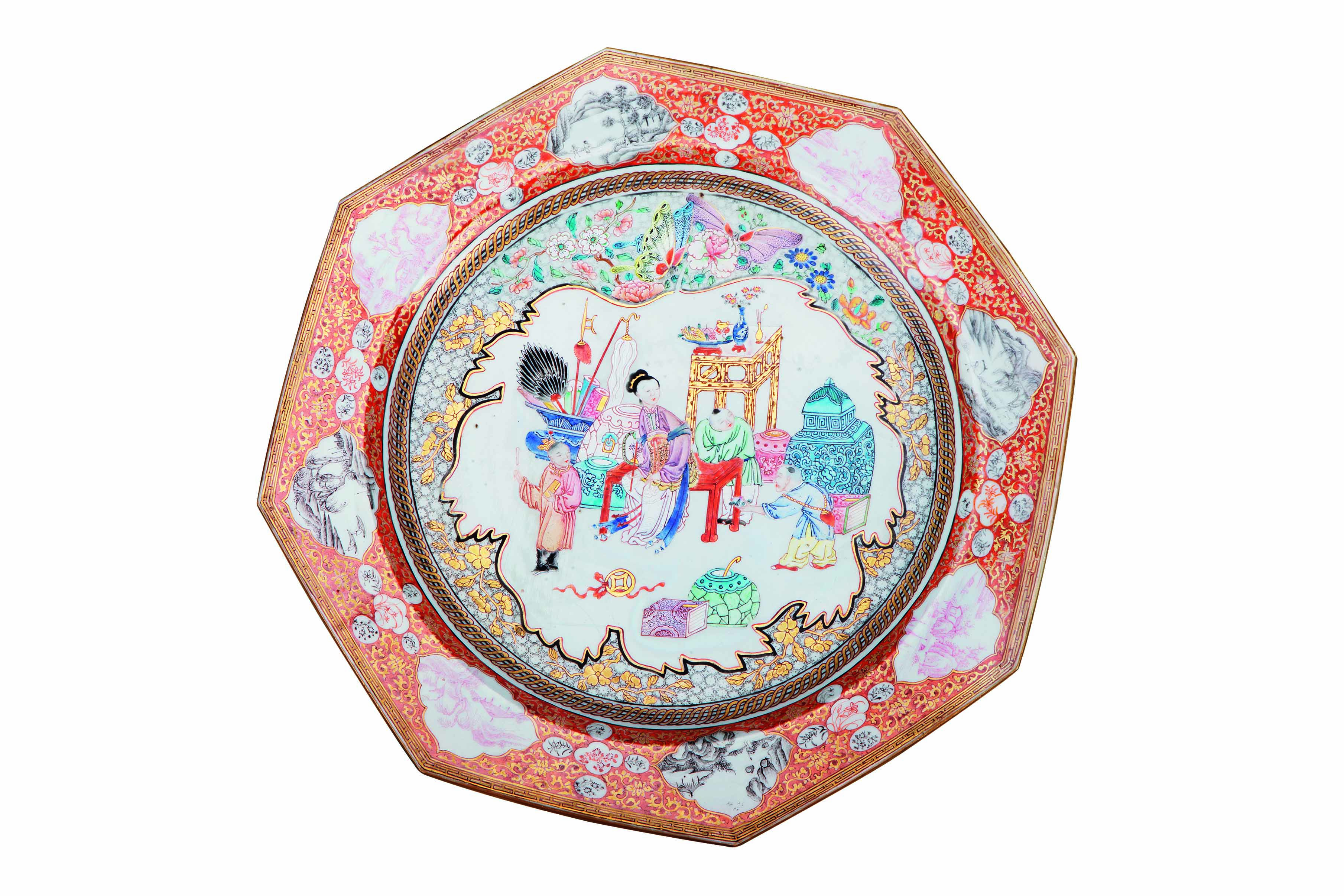 名称: 清乾隆广彩开光人物纹八棱形瓷盘 年代: 清·乾隆 (1736—1795 年 ) 类型: 瓷器 质地: 瓷 尺寸: 高 3.5 厘米,口径 35 厘米,底径 21 厘米 来源: 广东省博物馆 盘八角形,板沿,平底。板沿以干大红描金缠枝花卉纹为地,八个开光内分别用西红和墨彩绘山水风景图。盘心花叶形开光内绘仕女婴戏图。画面构图丰满,色彩丰富、明丽,画工精细,给人以华丽、温馨的视觉感受。仕女婴戏纹饰的瓷器,在雍正、乾隆时期特别受欧洲人的喜爱。