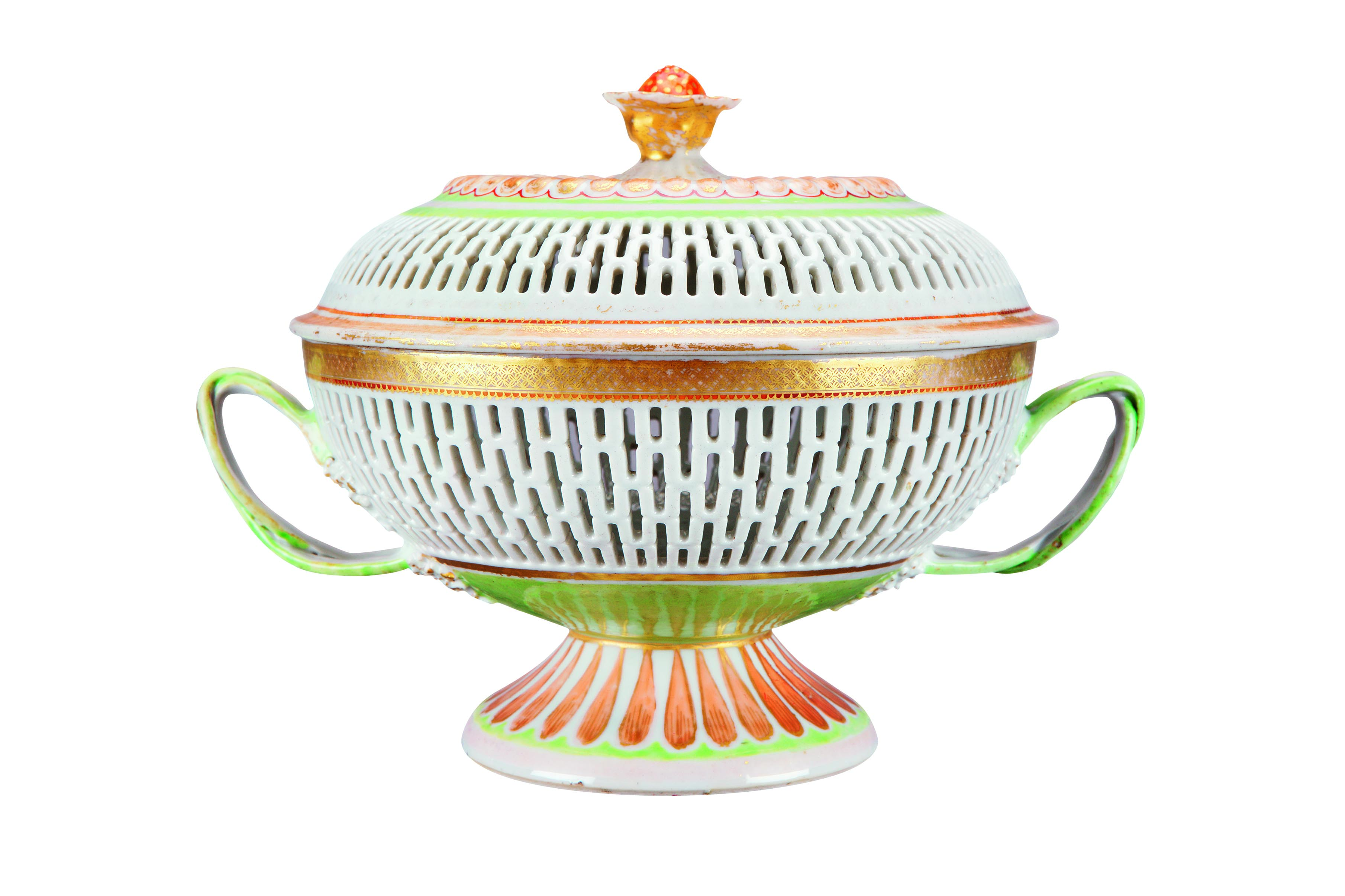 - 罐作镂空设计,花形盖钮,喇叭形高足。盖与足作菊瓣纹装饰,与镂空处融为一体、互相呼应。这是西方人用于盛装板栗等干果的容器,因此需要镂空透气的设计。此盖罐绘有Nassau和Prussia联姻的纹章。该套餐具于179年献给Prussia公主及其驸马奥兰治的威廉五世。威廉五世是英格兰安妮公主之子、乔治二世之孙。整套餐具共一千余件,精美而华丽。