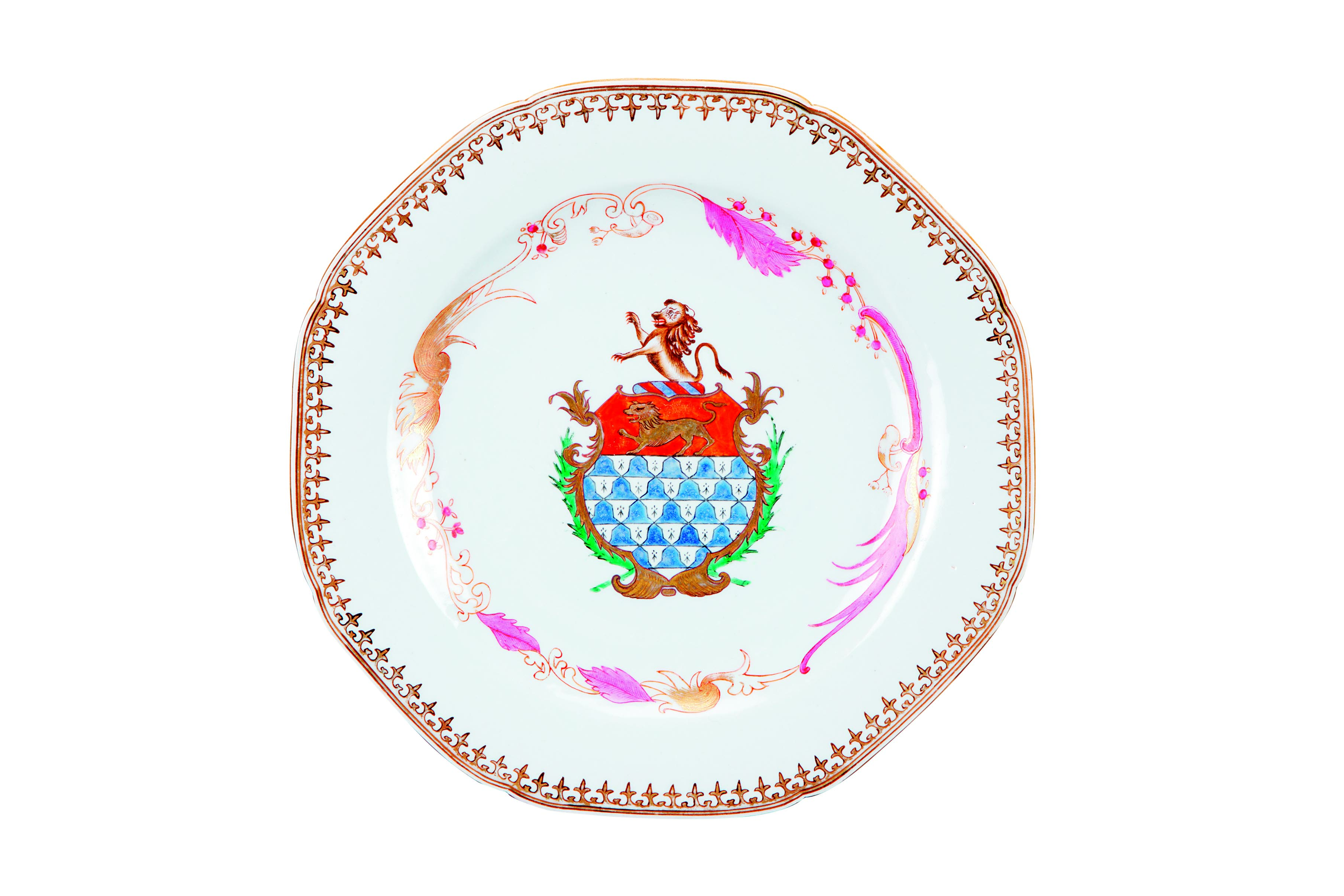 名称: 清乾隆广彩描金英国东印度公司"Toswell"纹章纹八角形盘 年代: 清·乾隆 (1736—1795 年 ) 类型: 瓷器 质地: 瓷 尺寸: 高 1.9 厘米,口径 22.5 厘米,底径 13 厘米 来源: 广东省博物馆 此盘为东印度公司成员William Taswell定制。他祖上本在伦敦从事商业,1715年,家族移民至美国弗吉尼亚,成为美国Taswell家族的创始人。