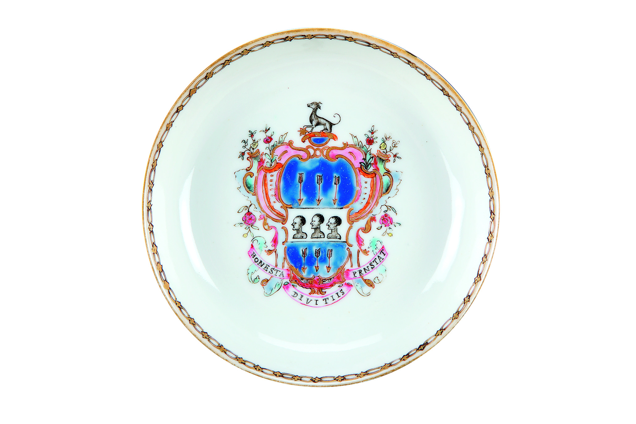 名称: 清乾隆广彩花卉纹章纹碟 年代: 清·乾隆 (1736—1795 年 ) 类型: 瓷器 质地: 瓷 尺寸: 高 2 厘米,口径 11.8 厘米,底径 7 厘米 来源: 广东省博物馆 此茶具上饰有Watts(或Kaynell)家族纹章。伦敦商人John Watts藏书标签上有同样的纹章,只是风格不一样,所以根据这段时期的记载,这些瓷器出自他本人。
