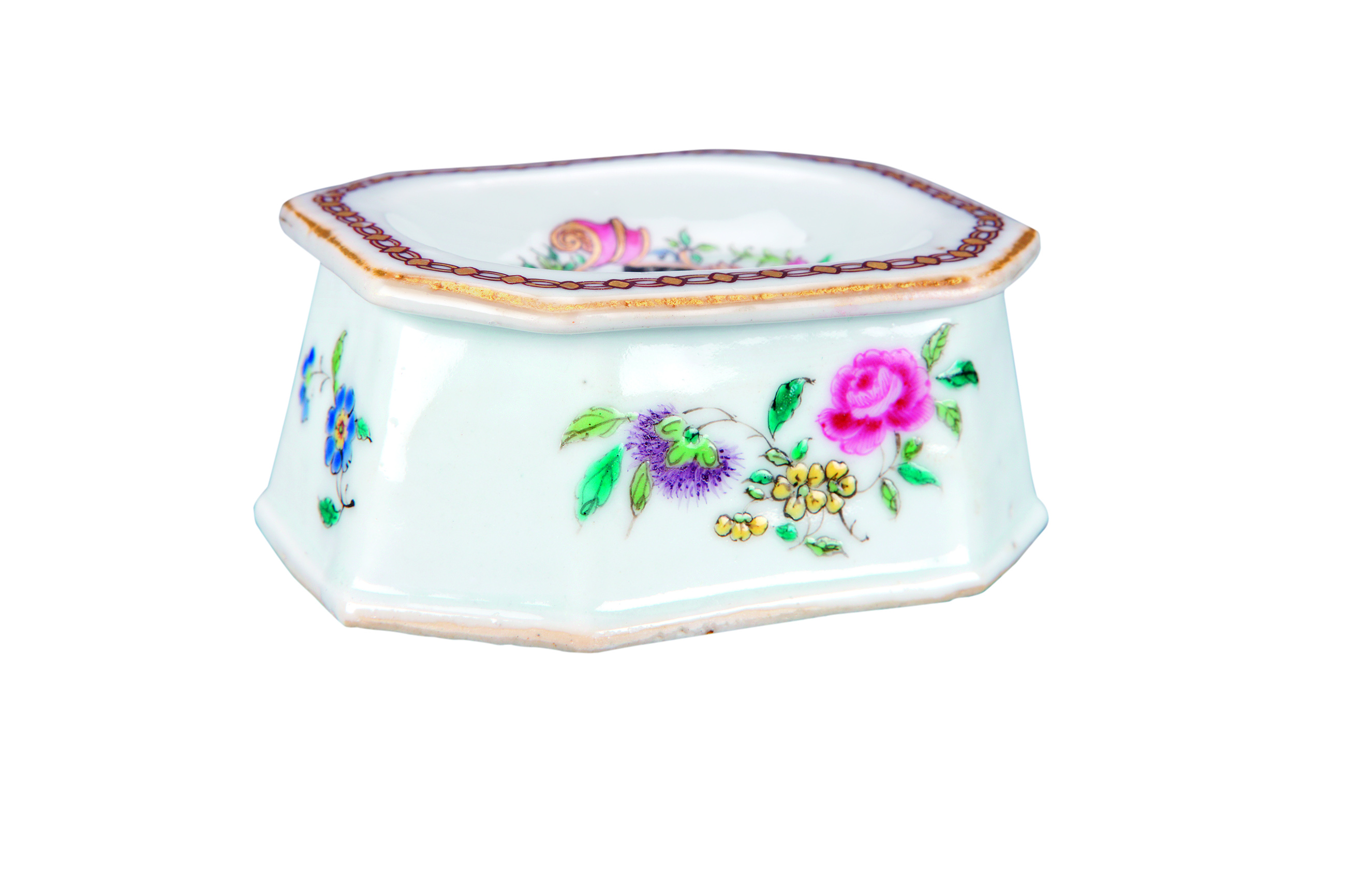 名称: 清乾隆广彩花卉纹章纹盐碟 年代: 清·乾隆 (1736—1795 年 ) 类型: 瓷器 质地: 瓷 尺寸: 高 3.8 厘米,口径 7.7×6.2 厘米,底径 8.5×6.3 厘米 来源: 广东省博物馆 此碟上绘Herne家族和Ruggles家族的组合纹章。他们都居住在英国埃塞克斯郡(Essex)家族成员William Herne爵士于1797年担任郡长。