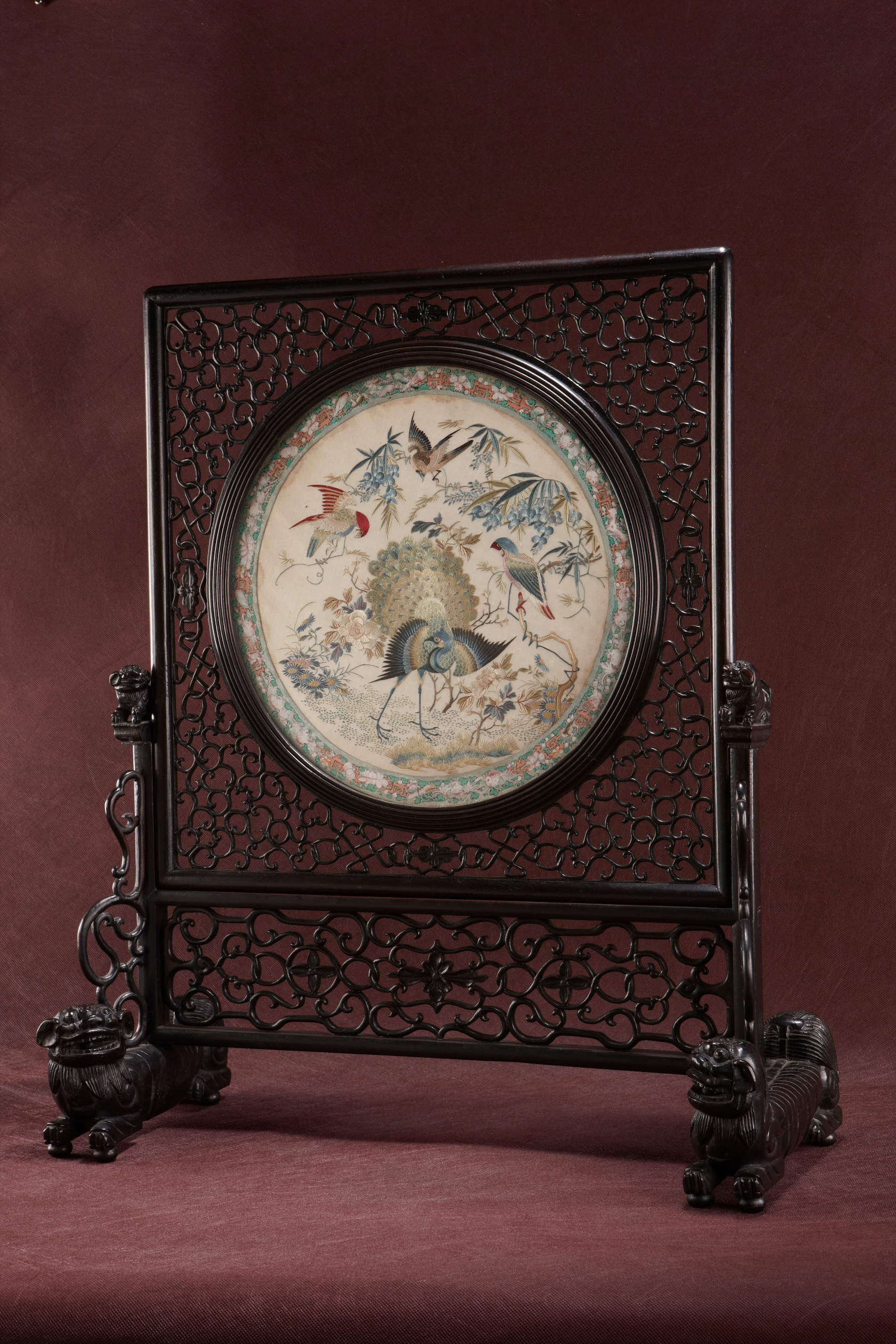 名称:清广绣孔雀纹圆形座屏