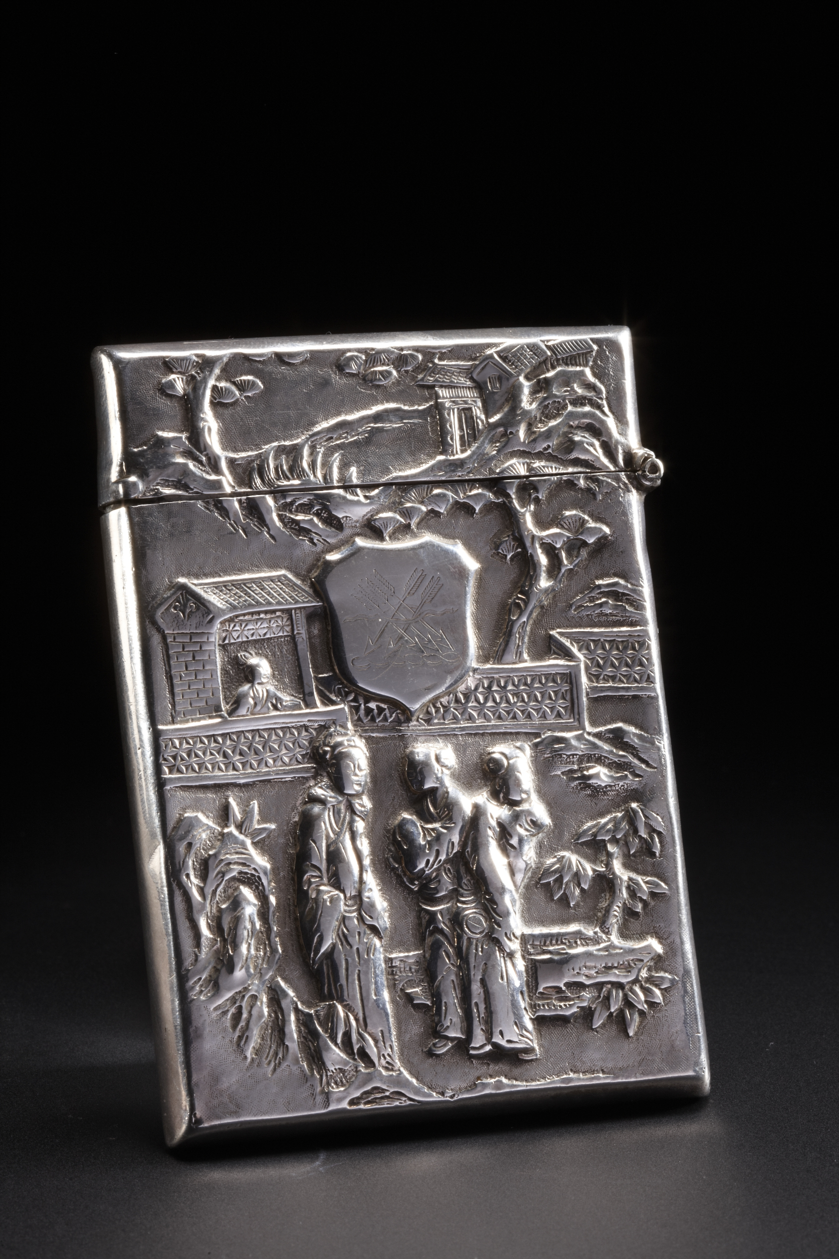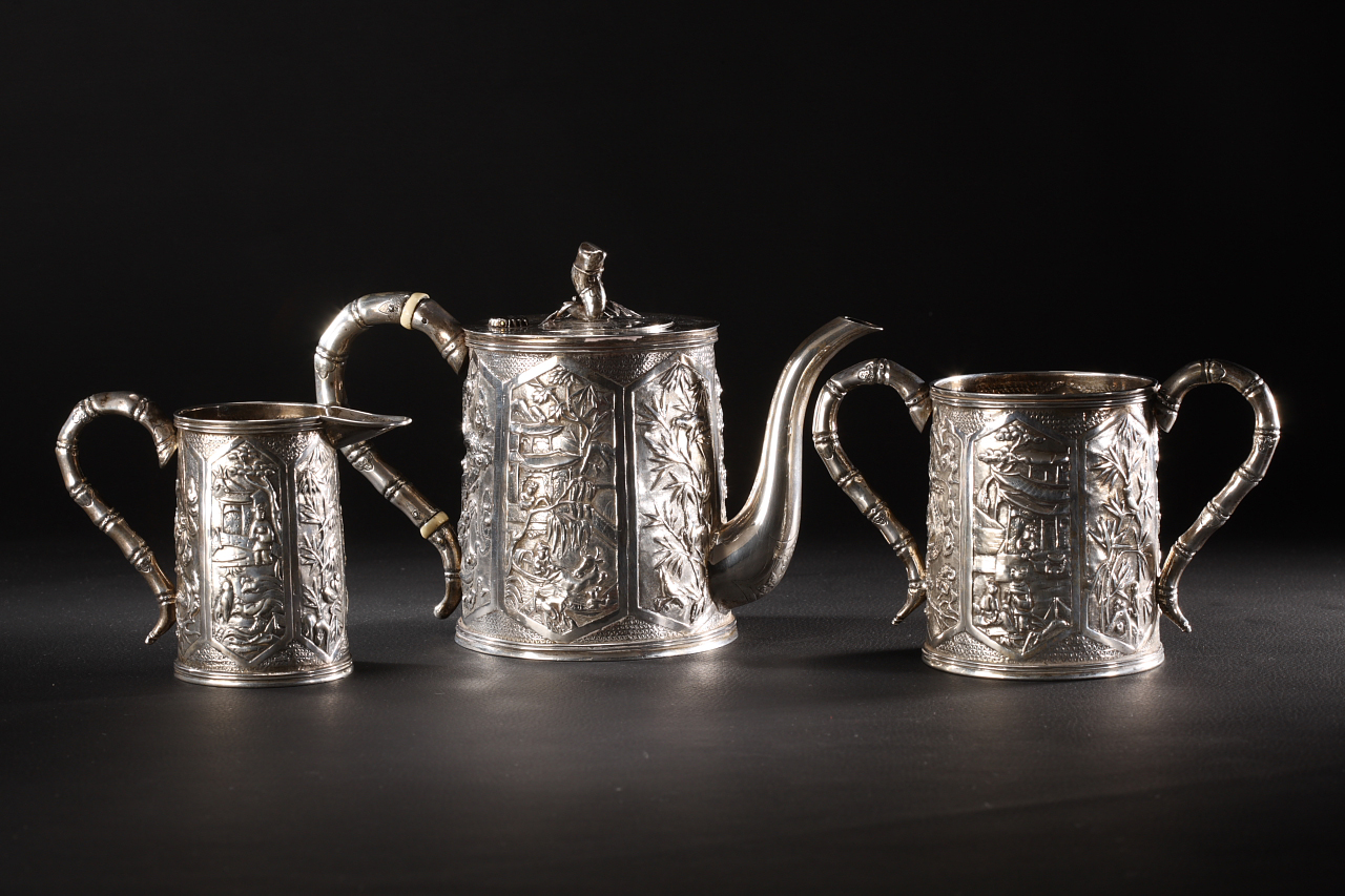 名称:约1870年银锤胎徽章留白KC款庭园人物图茶具