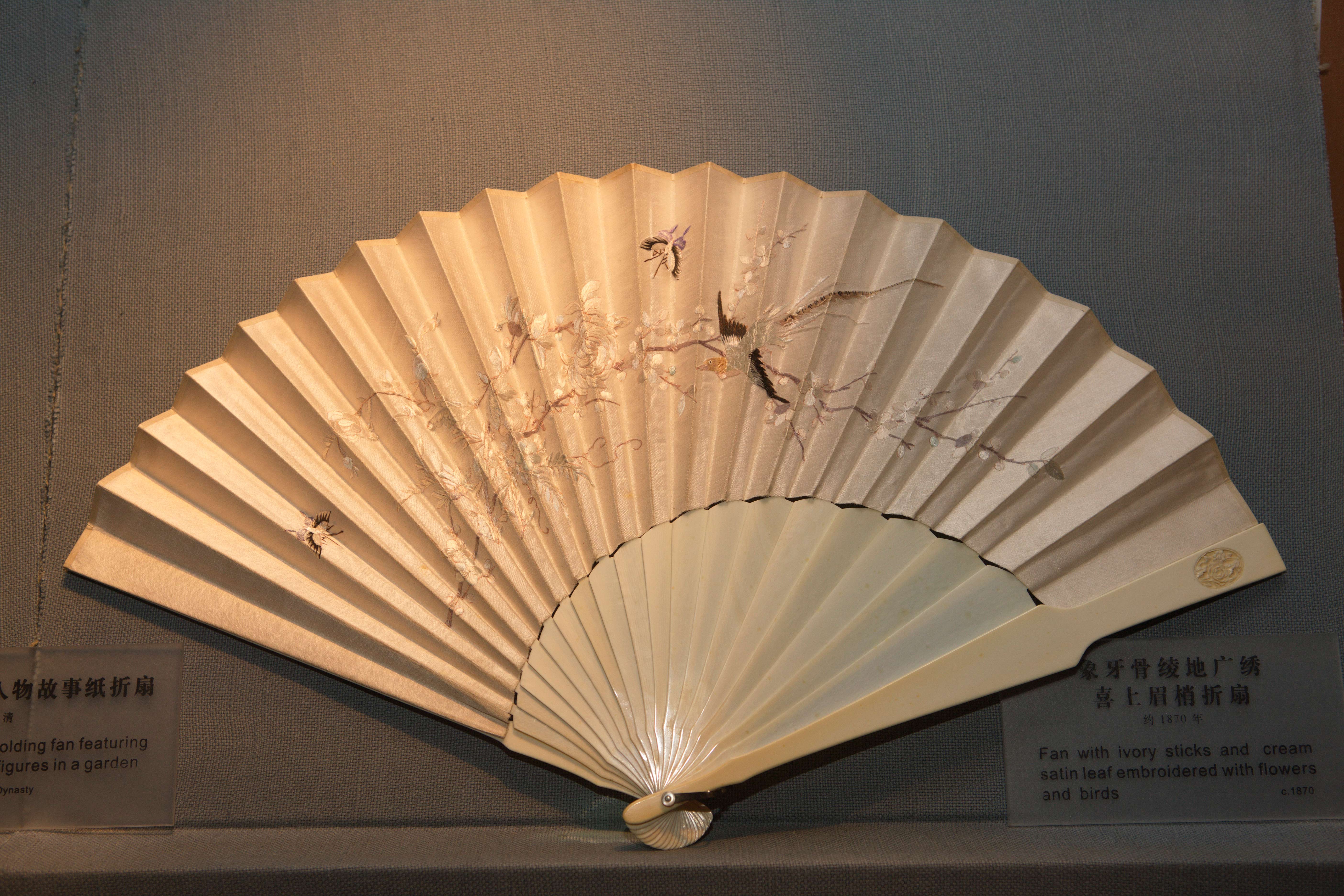 名称:约1870年象牙骨绫地广绣喜上眉梢折扇
