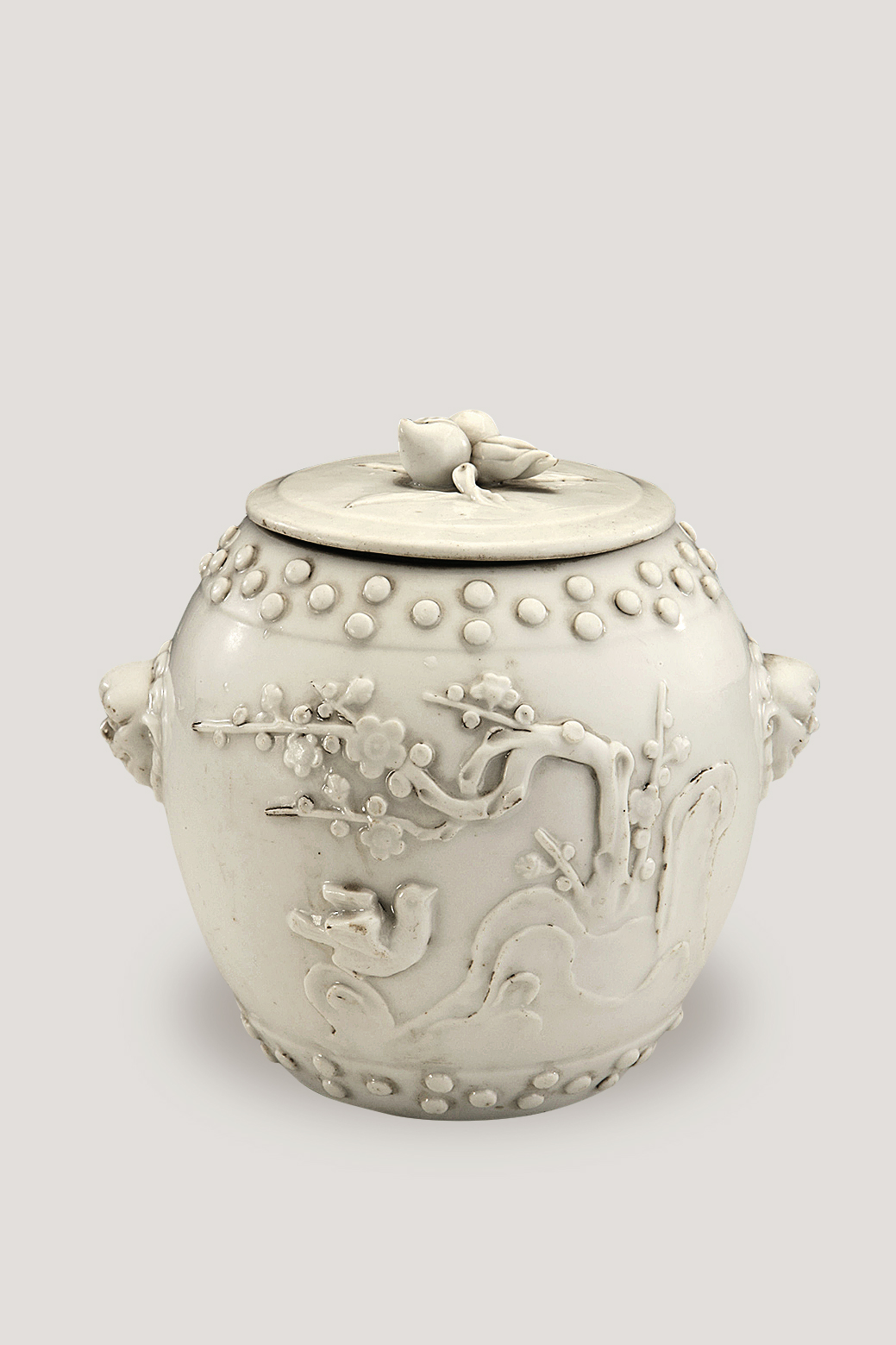 名称:清德化窑贴花双兽耳桃纽盖罐