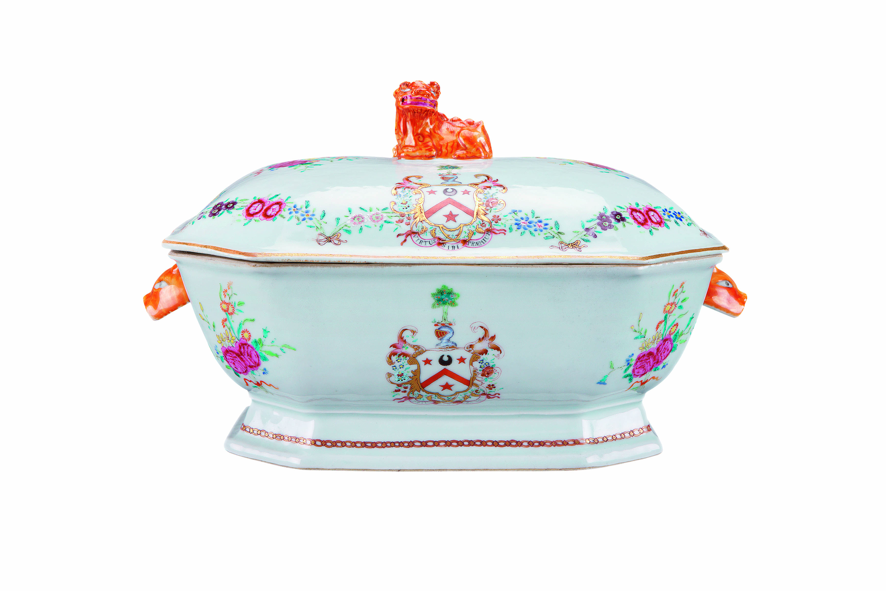 名称:清乾隆广彩花卉纹纹狮八角形带盖汤盆