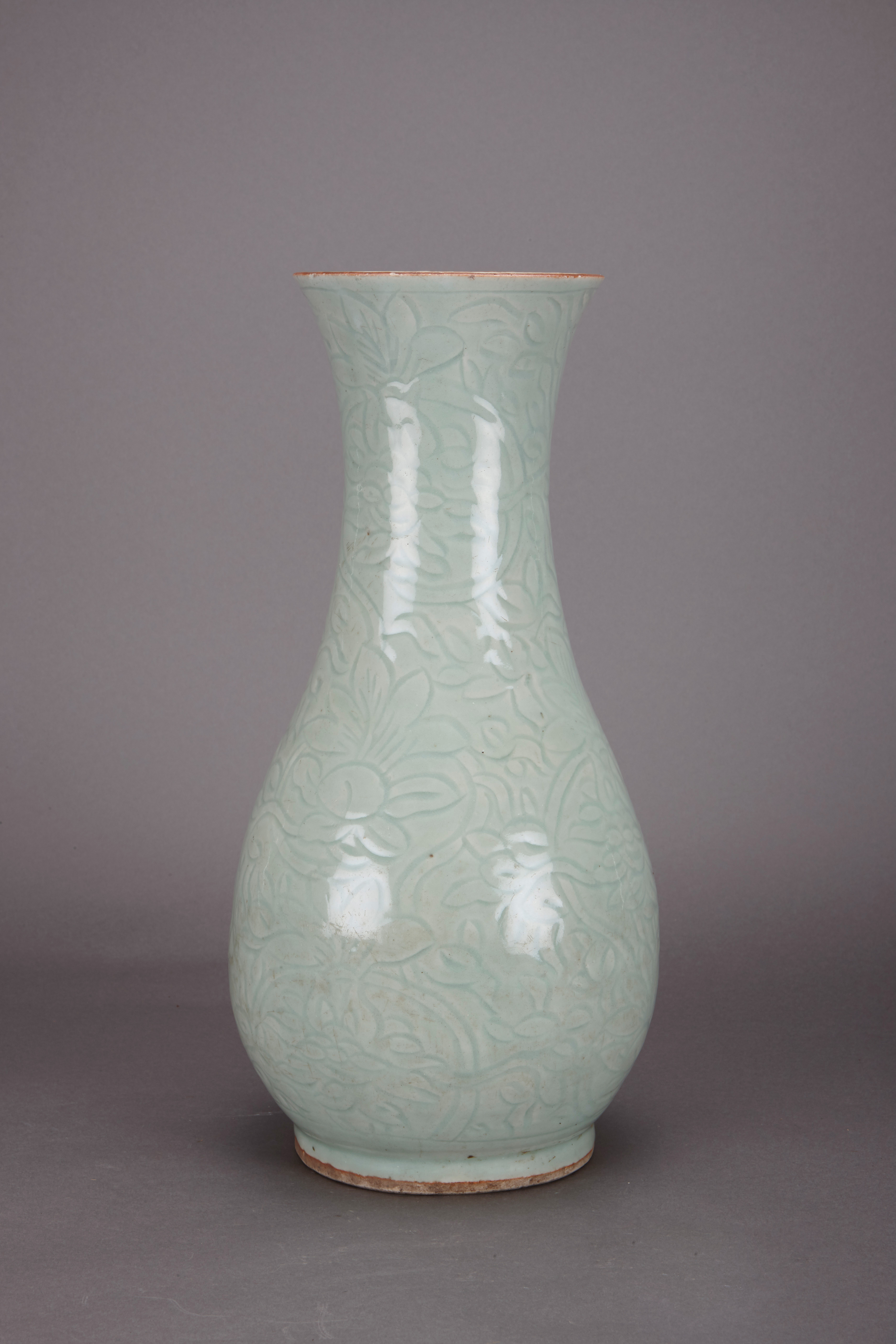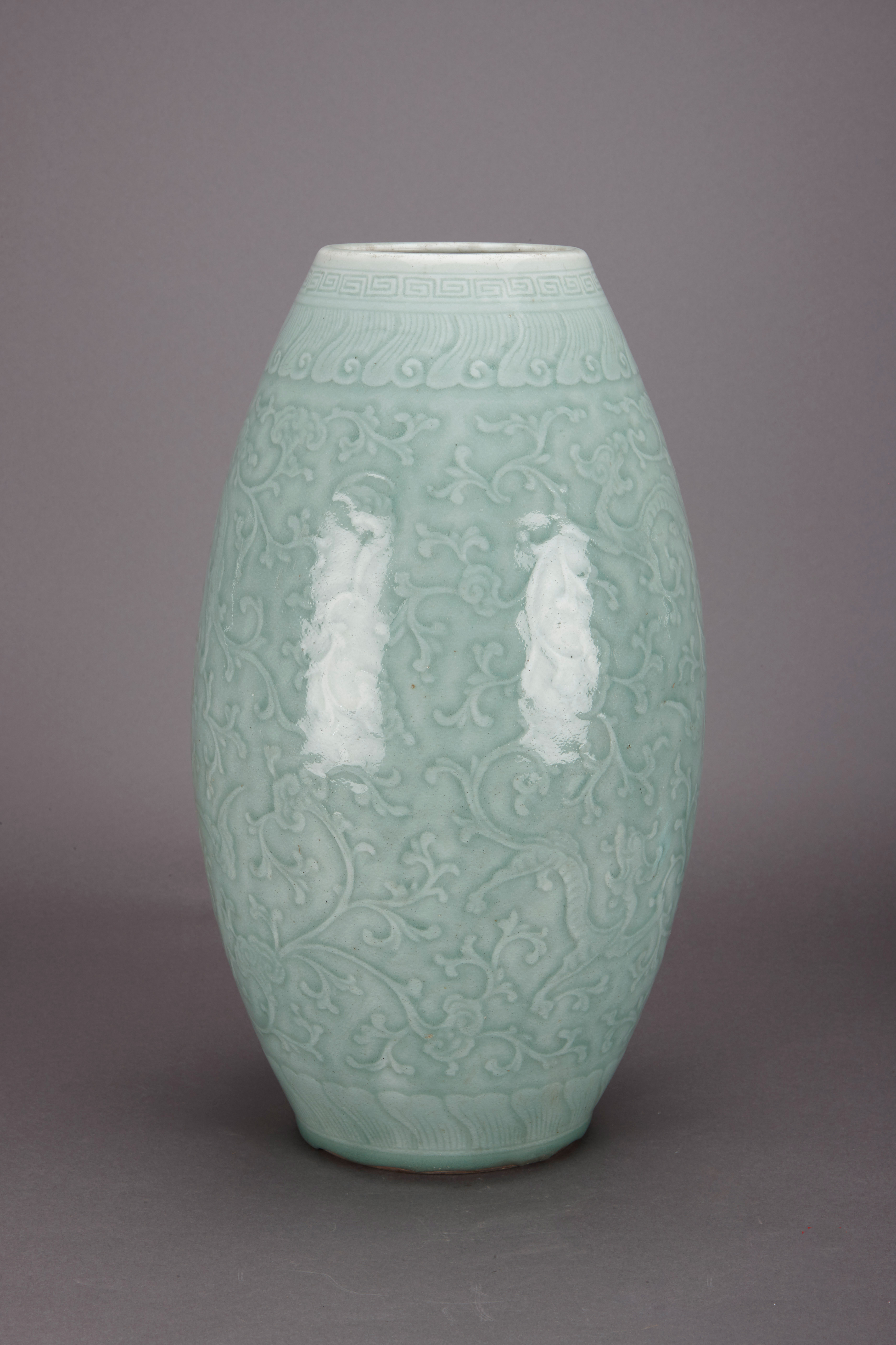 名称:清青釉刻灵芝龙纹橄榄瓶