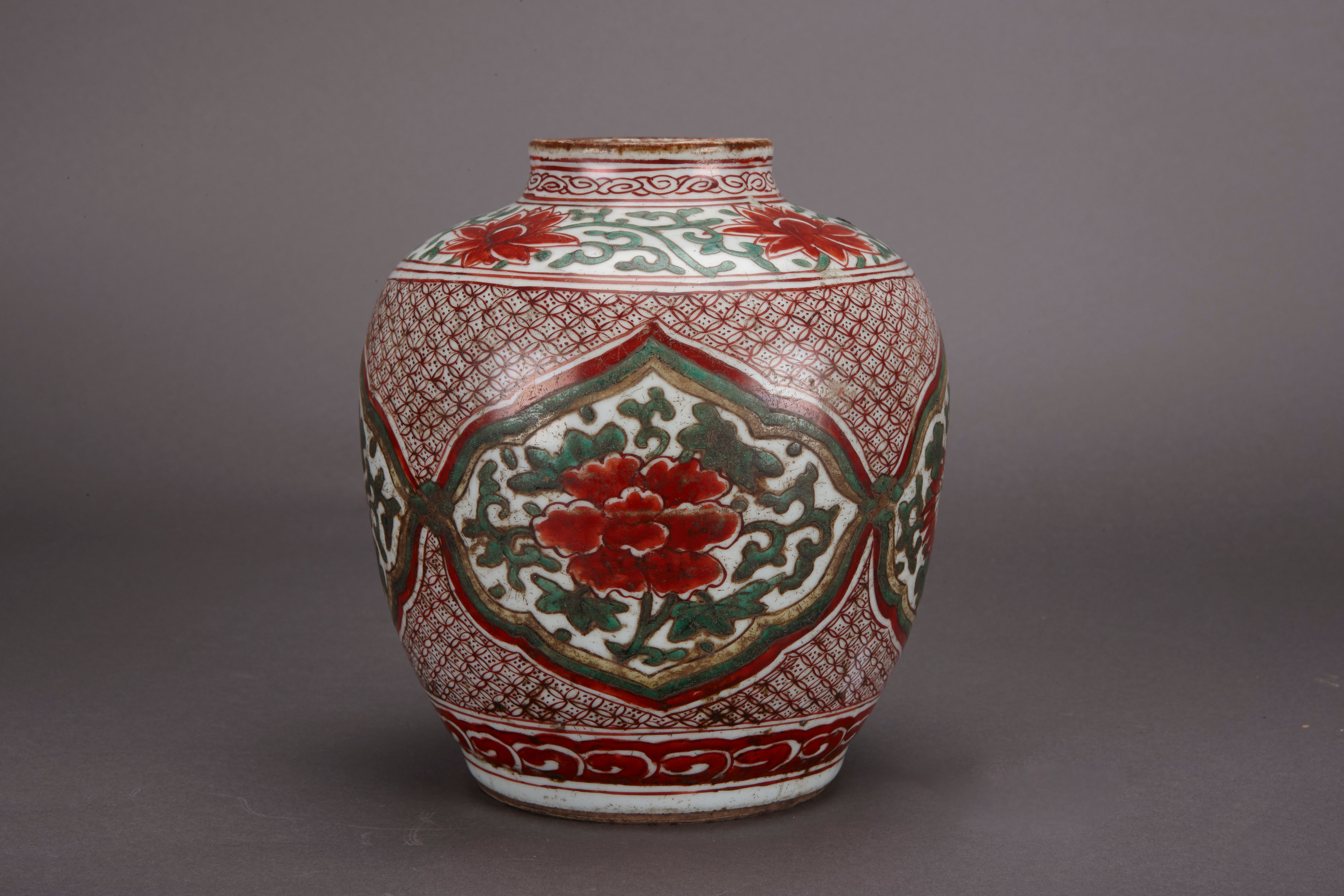 名称:清康熙五彩菱花形开光花卉纹罐