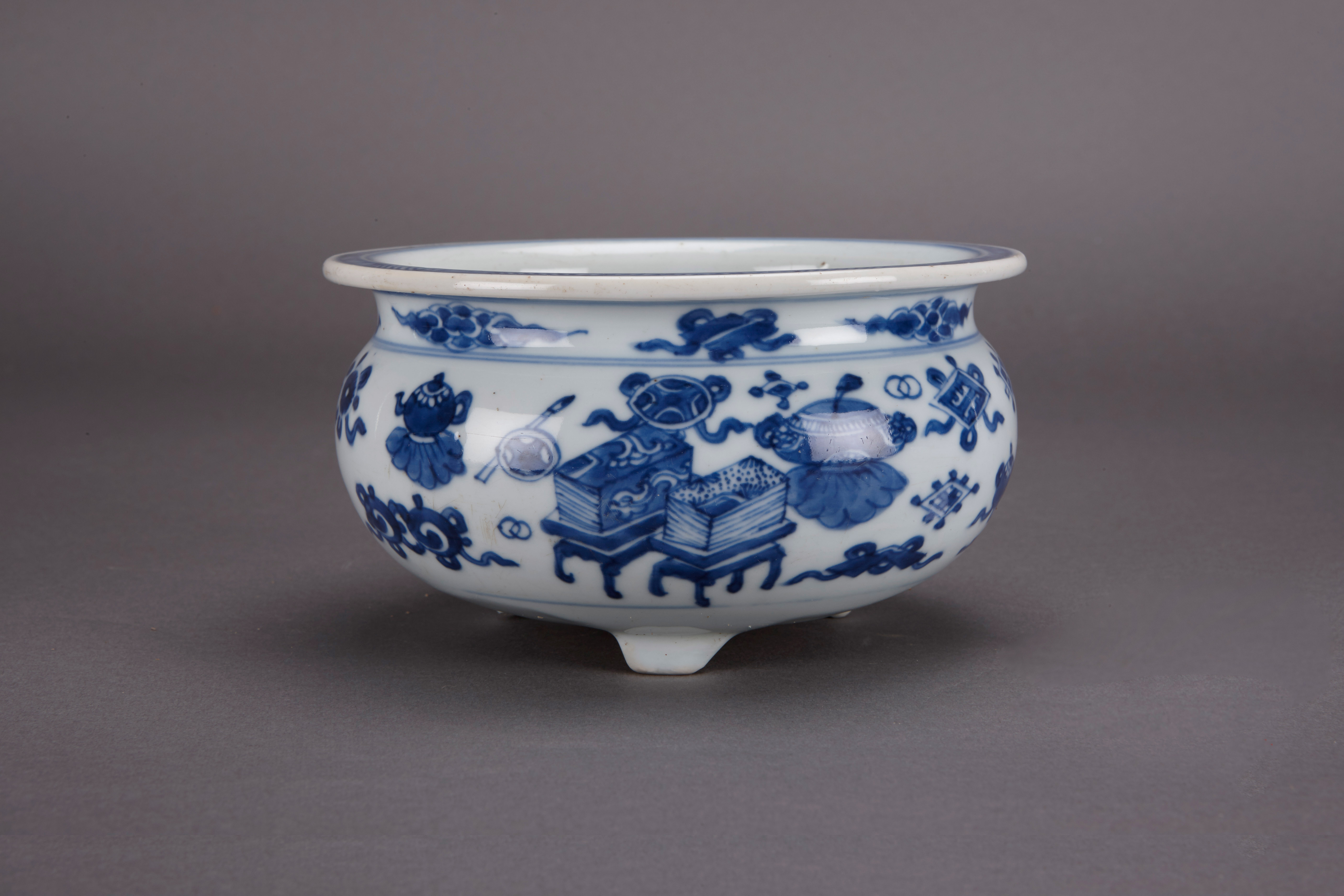 名称:清青花博古纹三足炉