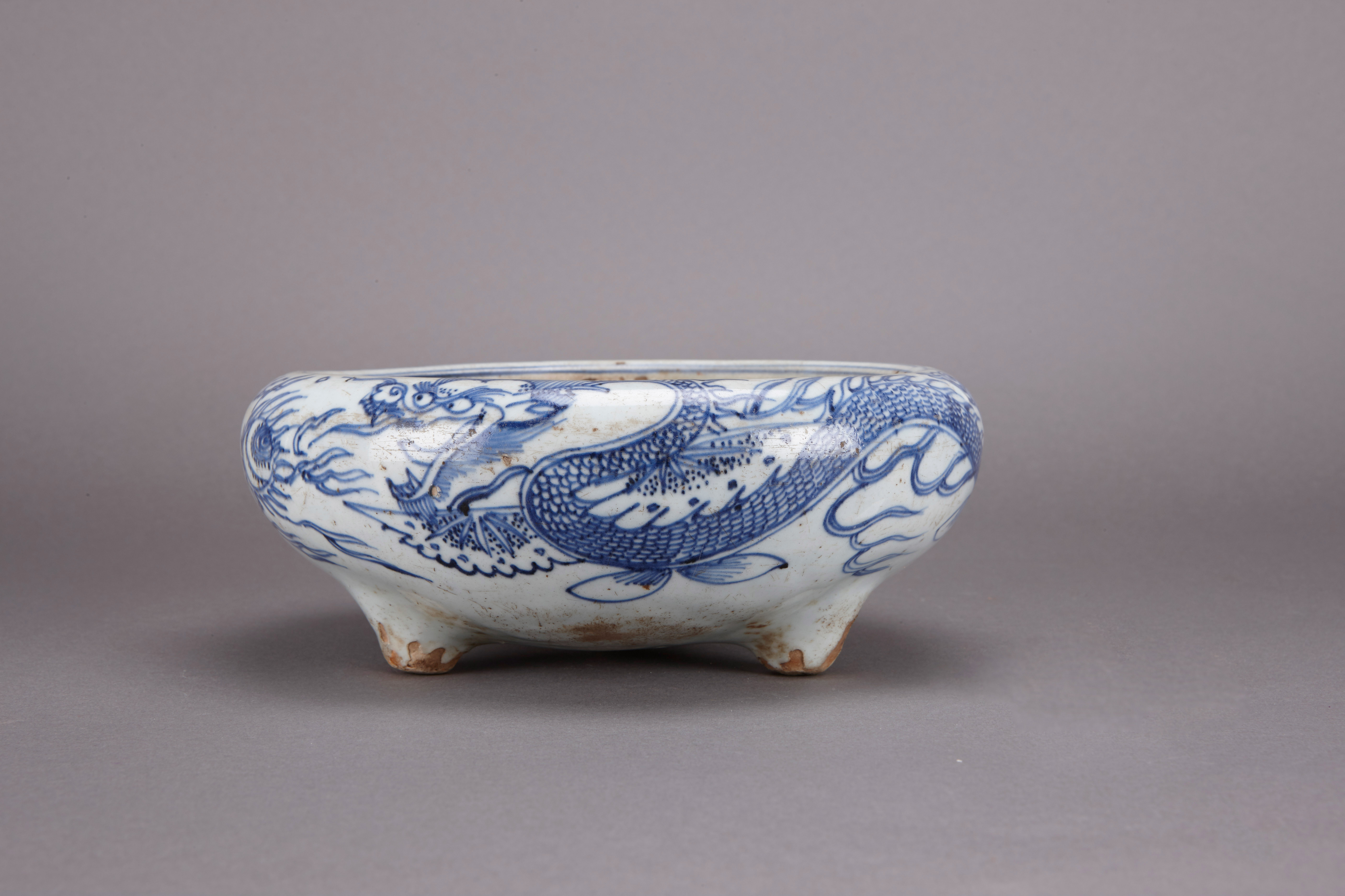 名称:明天启青花摩羯鱼龙纹三足炉