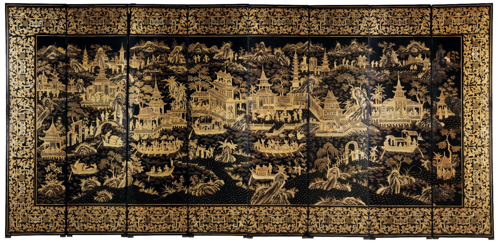 名称:十九世纪早期木胎黑漆描金龙舟竞渡图八围屏