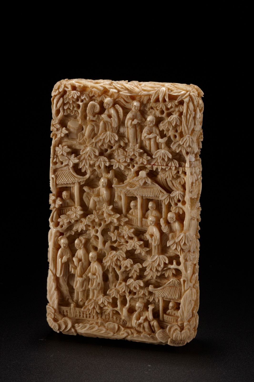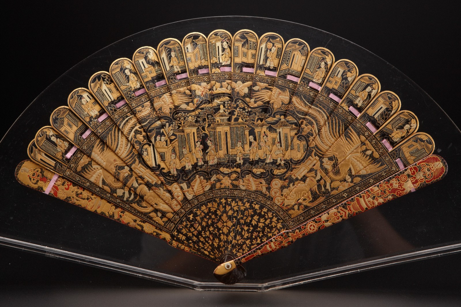 名称:十九世纪黑红漆骨凤纹开光人物故事图折扇