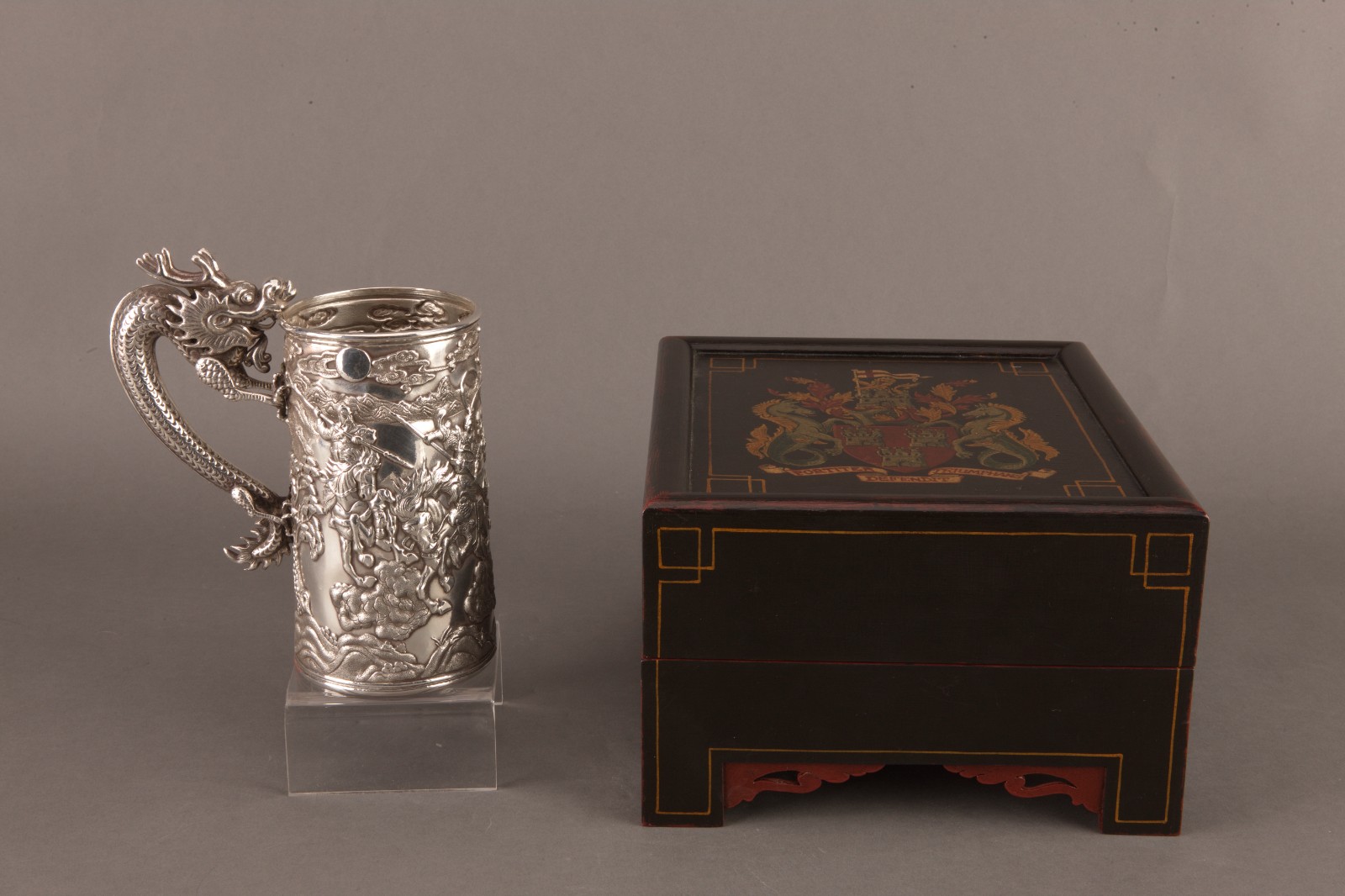 名称:十九世纪“CL 昌林”款外销银錾“三英战吕布”龙柄马克杯