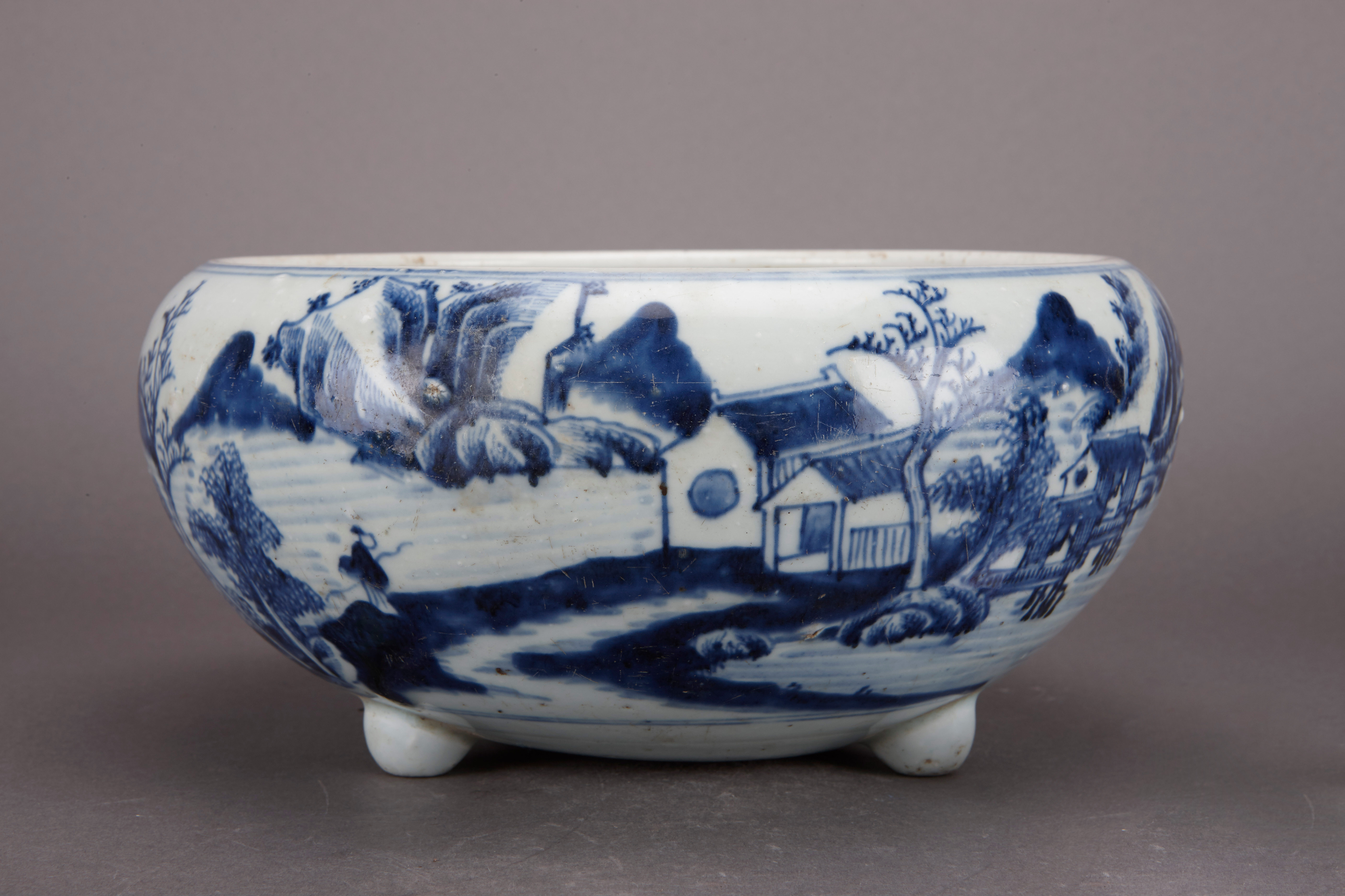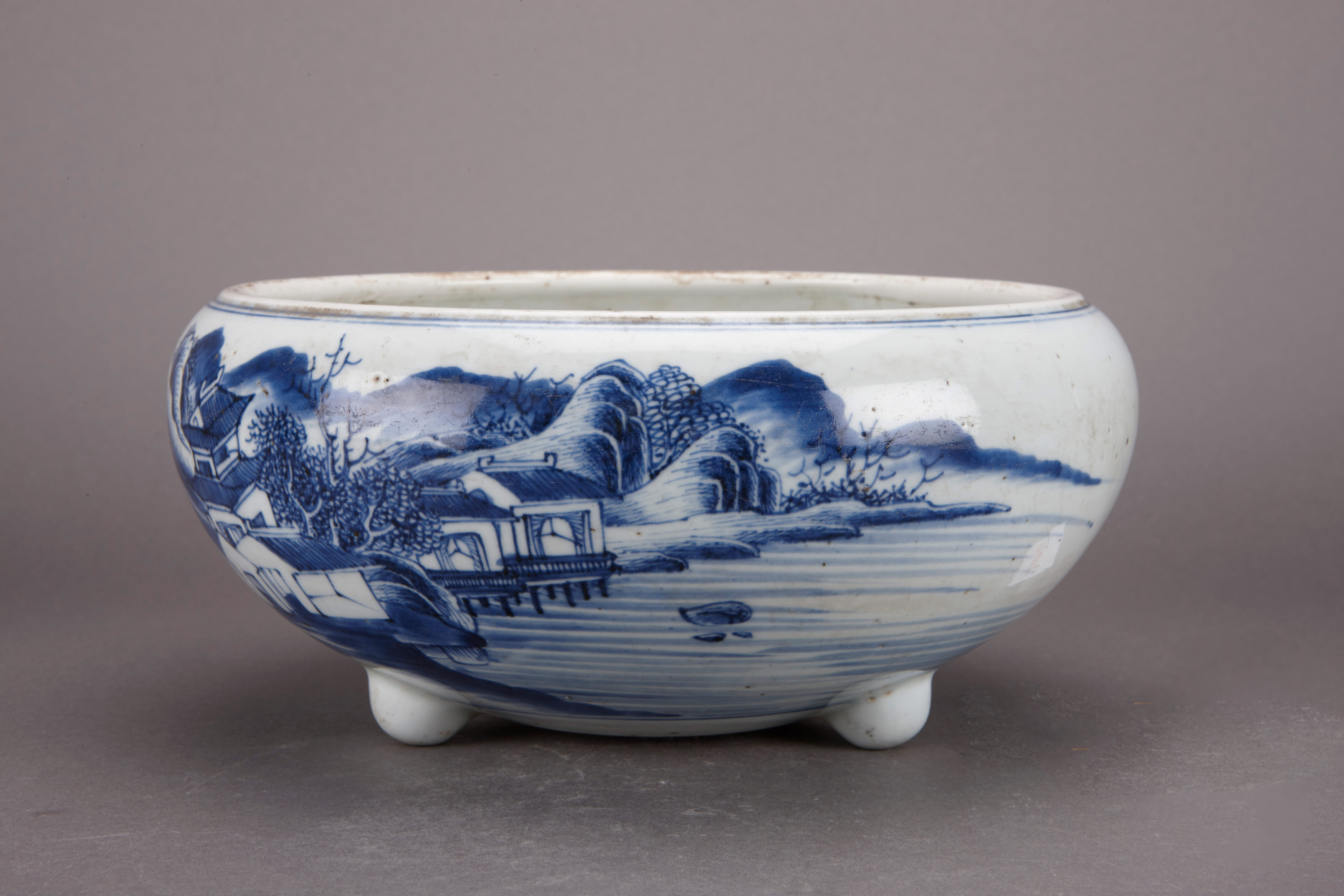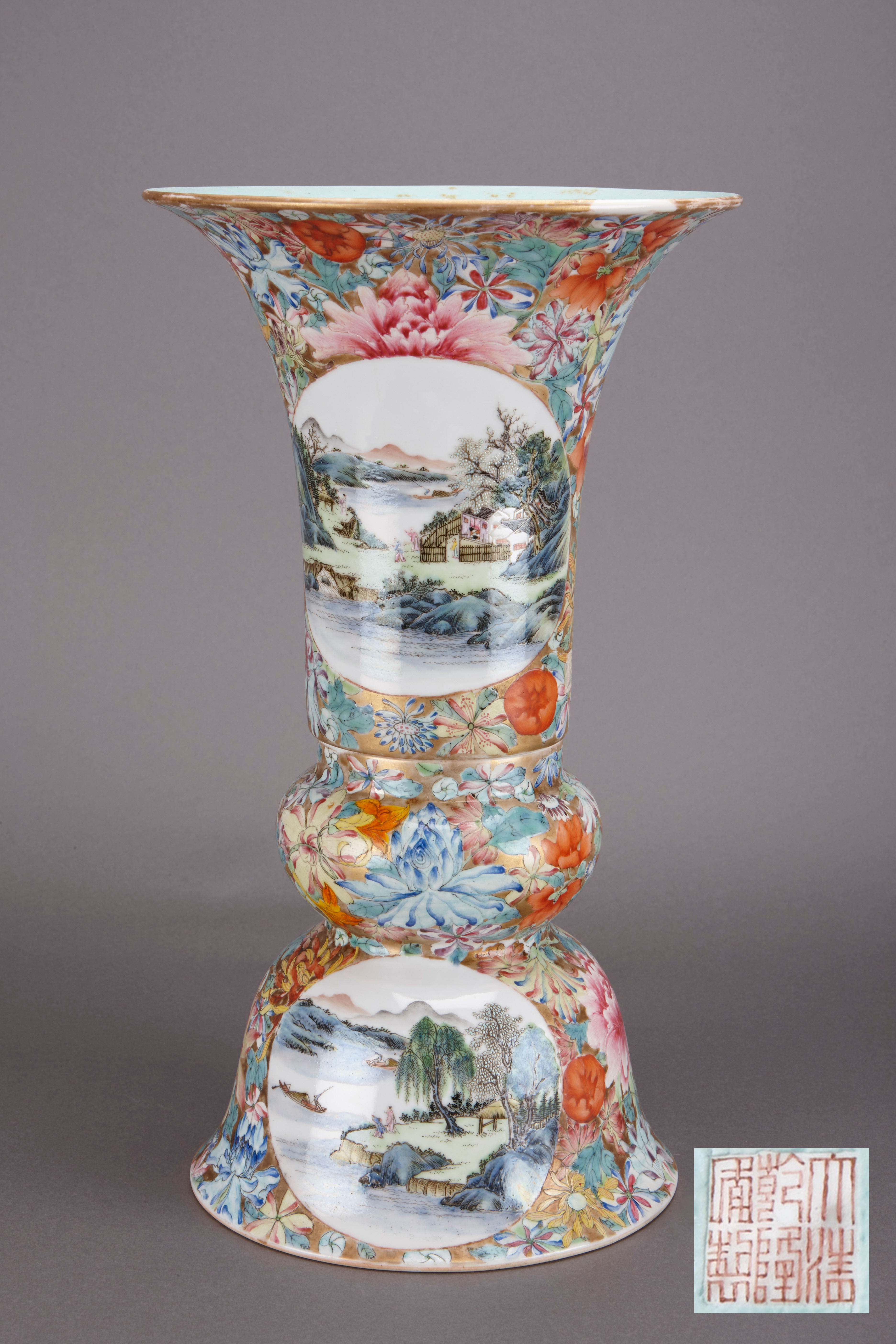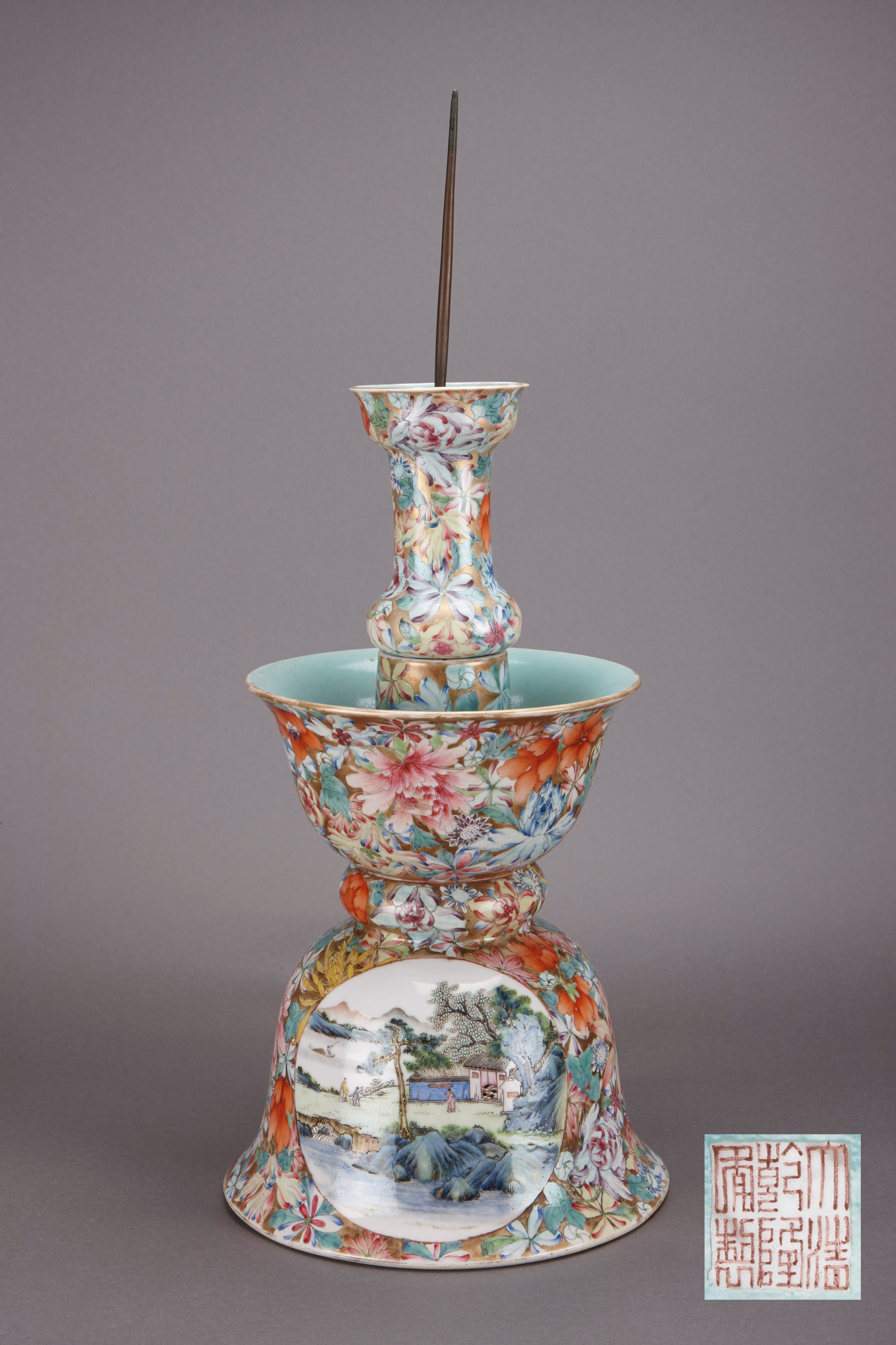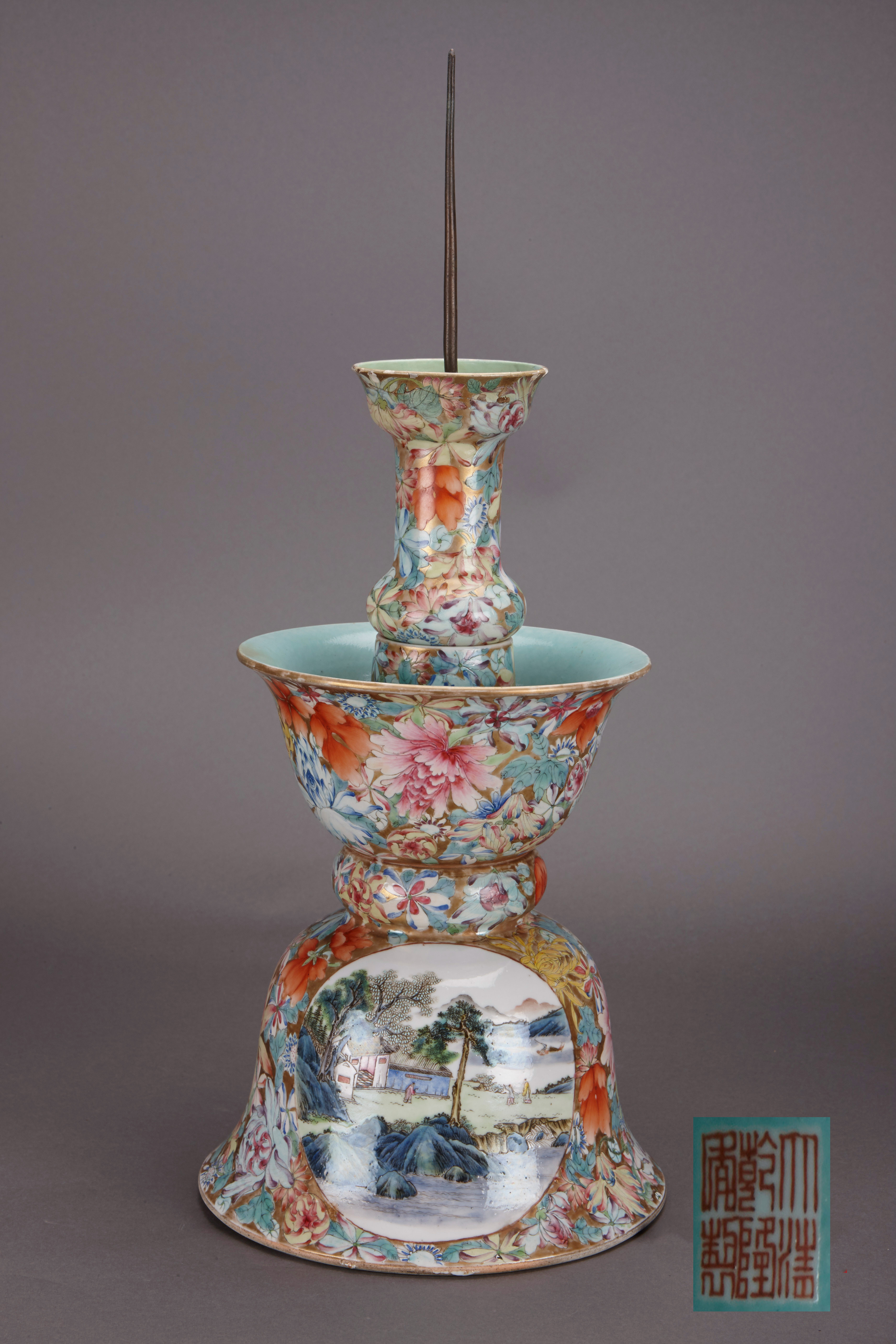 名称:民国粉彩开光山水花卉纹带盖三足熏炉